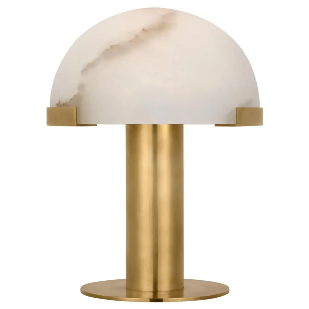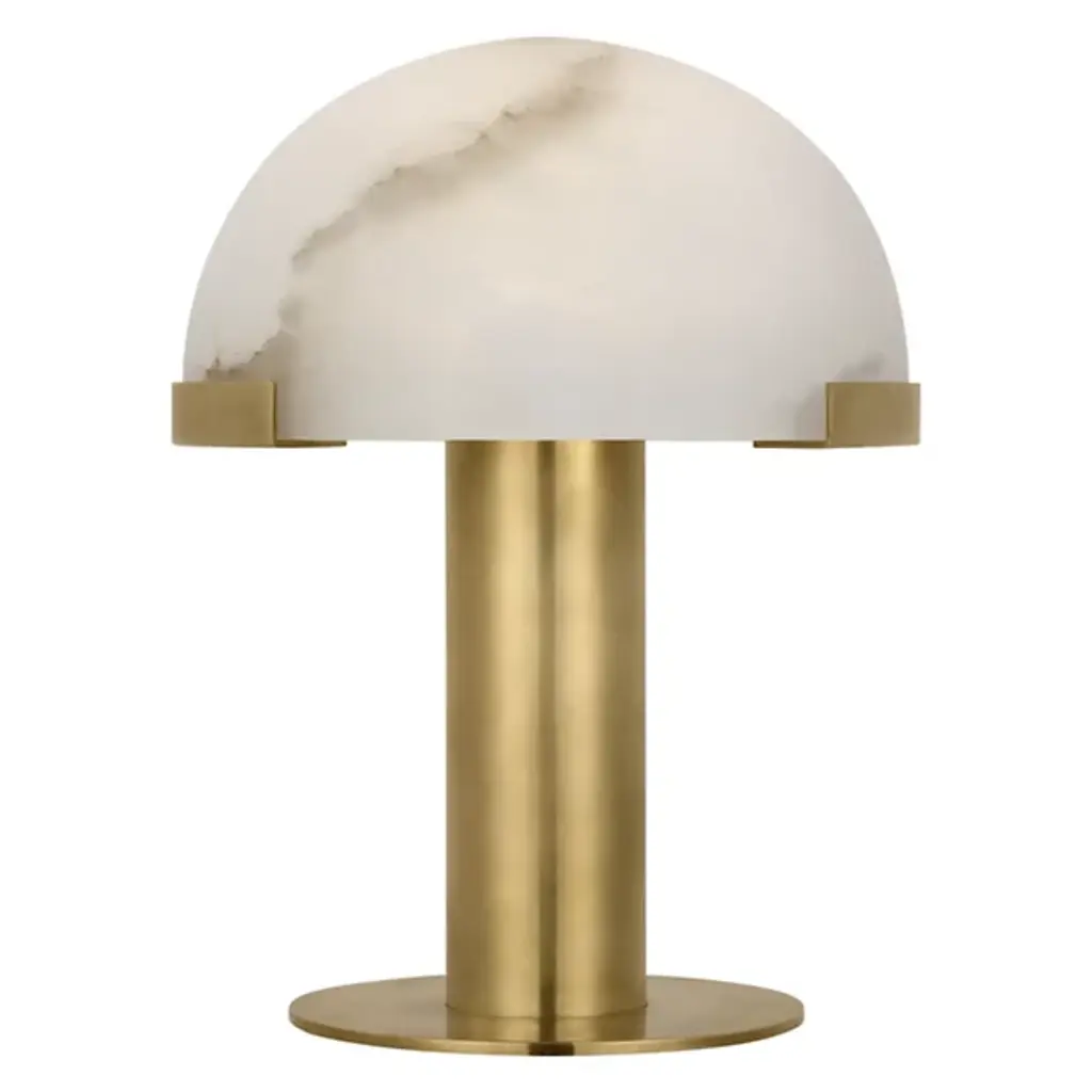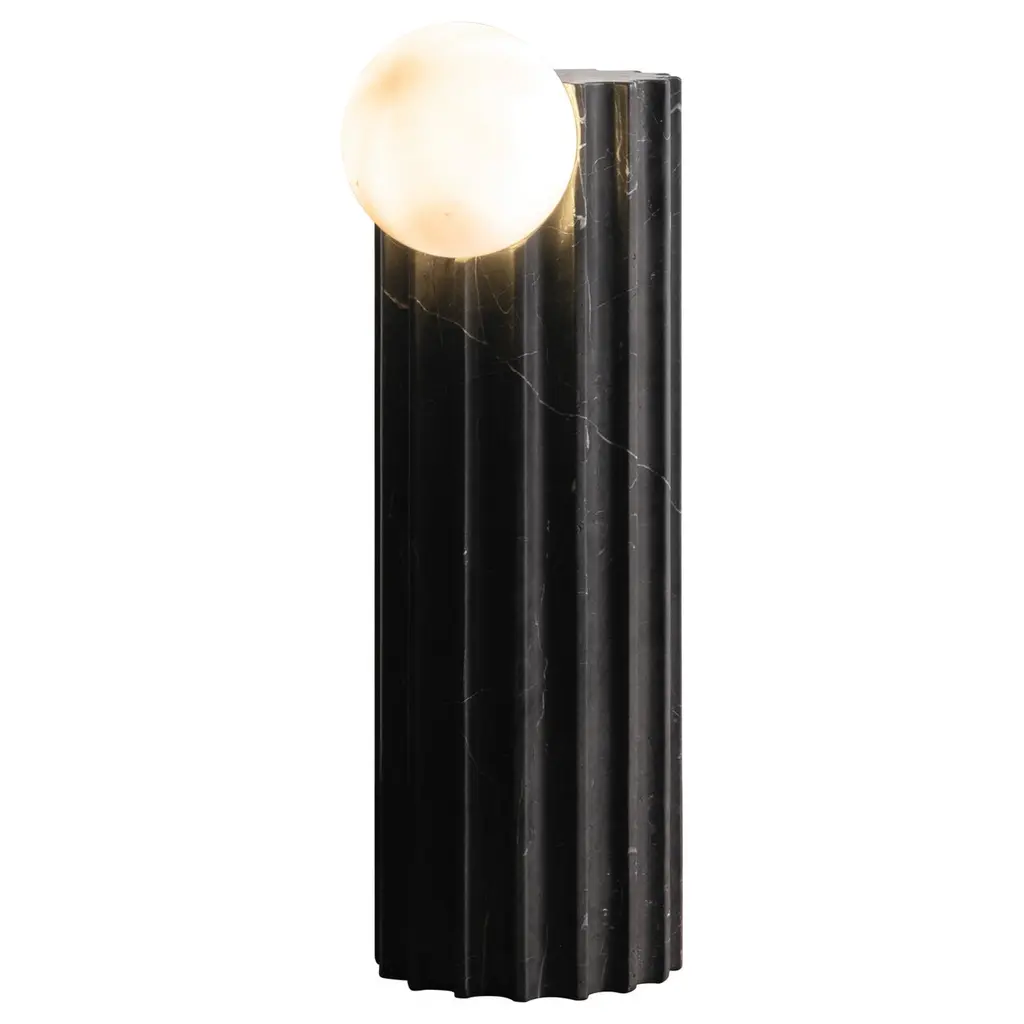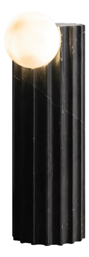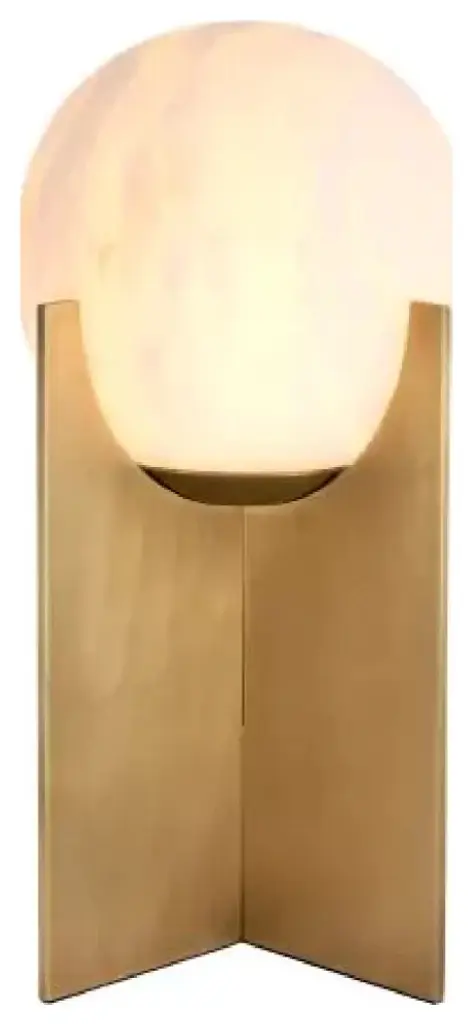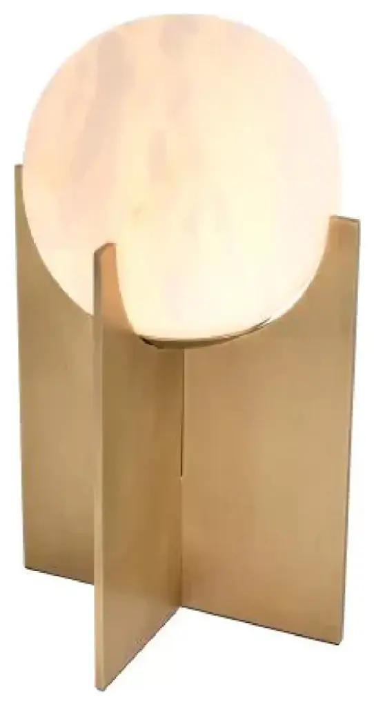Table Lamp Scorpios reminds one of the moons thanks to the vein pattern on its alabaster sphere. The simple base of this minimalist table lamp features an antique brass finish. You can make the light look either warm white or bright white, depending on the type of bulb you use.W9 x D9 x H16 in, Weight 20lbsMaterial, Alabaster, Iron1 Bulb, Max. 40W - E12 - 110 Volt