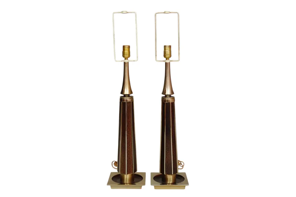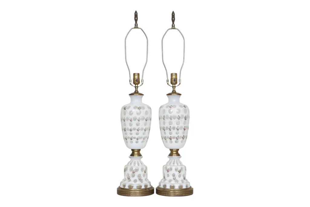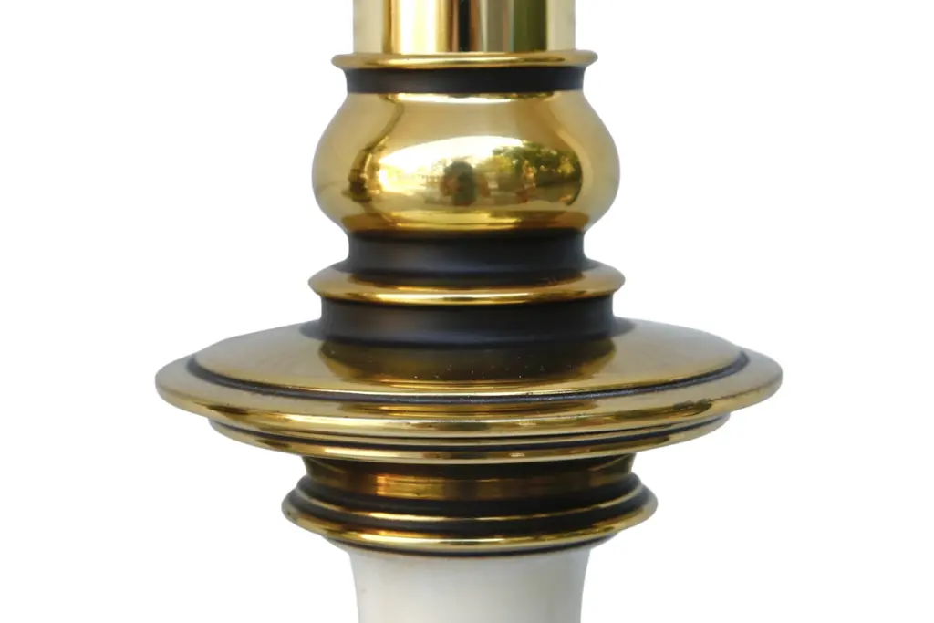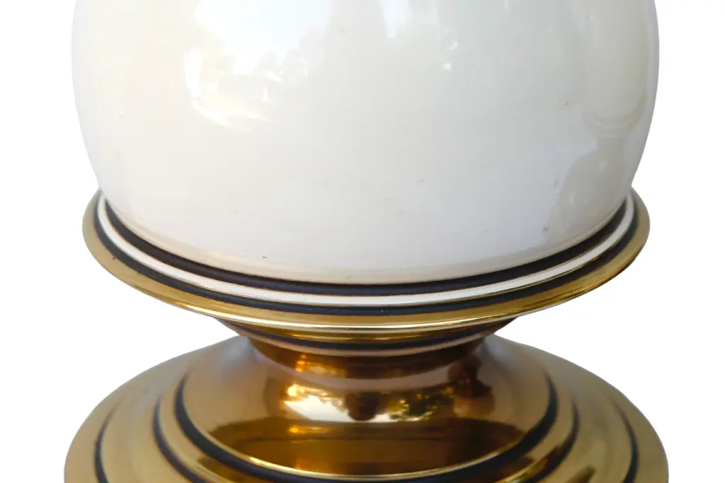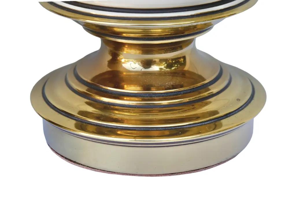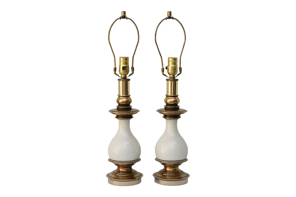 A pair of Regency style baluster shaped table lamps in gold and white by Stiffel. Bright gold colored brass is turned with a central white enameled vase. Each lamp measures 16.5"H to top of socket, 22.5"H to top of finial.