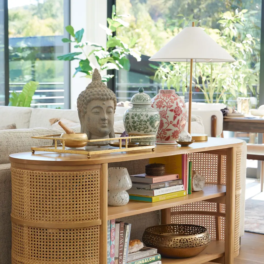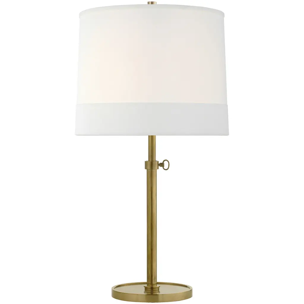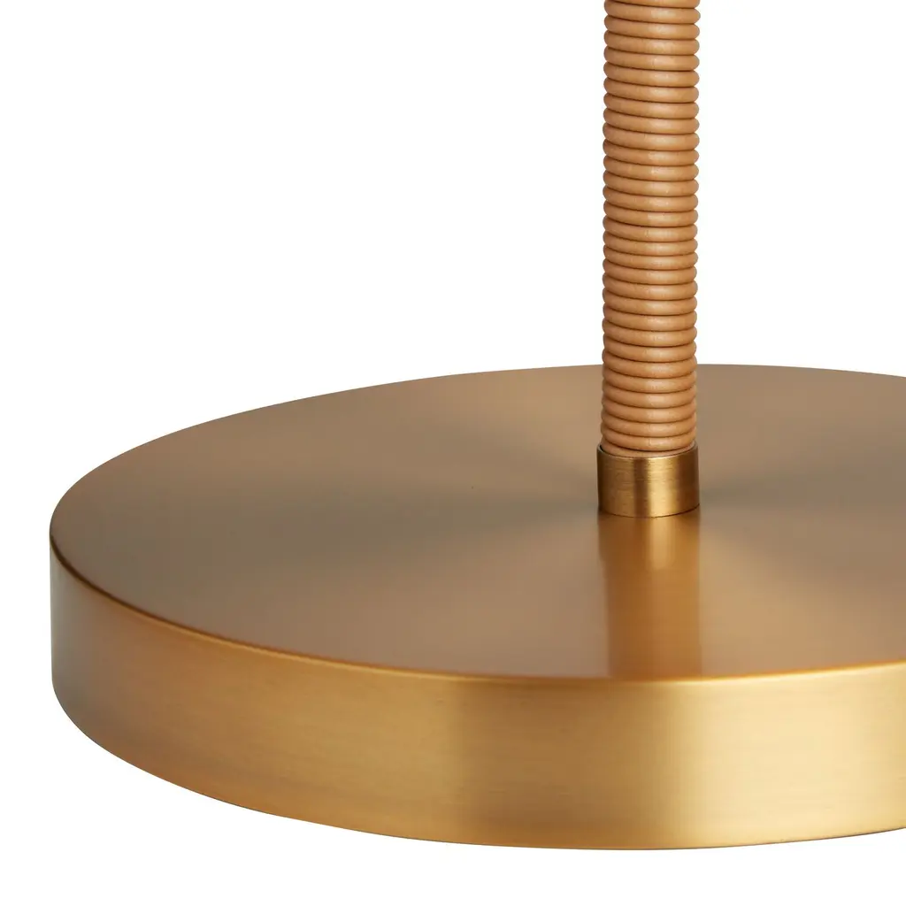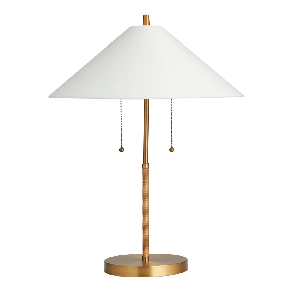 Taking inspiration from Danish design, our exclusive 2-light table lamp features a round base and slender antique-brass pole wrapped in faux rattan. At home in mid-century, modern and Scandinavian-styled interiors, this light is topped with a white fabric empire shade. Two pull-chain switches add to this lamp's luxe intrigue.