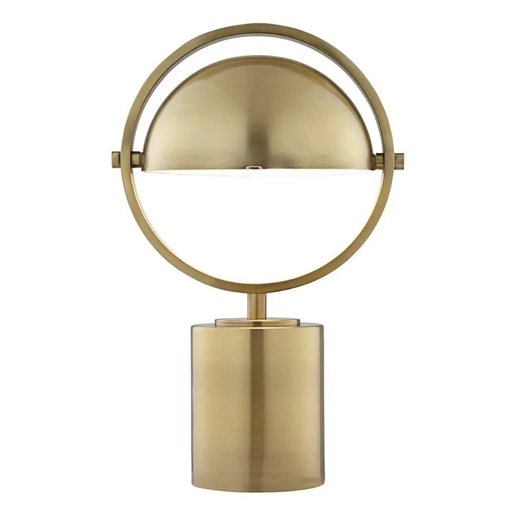 Product Details 17" high overall. Mushroom dome shade is 8" wide. Base is 5" wide. Weighs 6.1 lbs. Uses one maximum 40 watt standard-medium base bulb (not included). On-off switch on the cord. Mushroom dome accent table lamp. Modern-industrial style inspired by modernist European designs. Brushed antique brass finish base, ring, and mushroom dome. Metal construction. Metal dome shade with open bottom in a ring frame. 6-foot long cord.