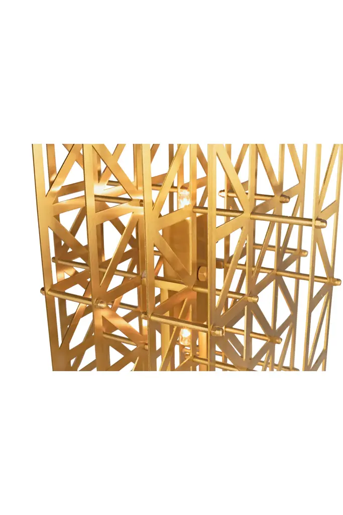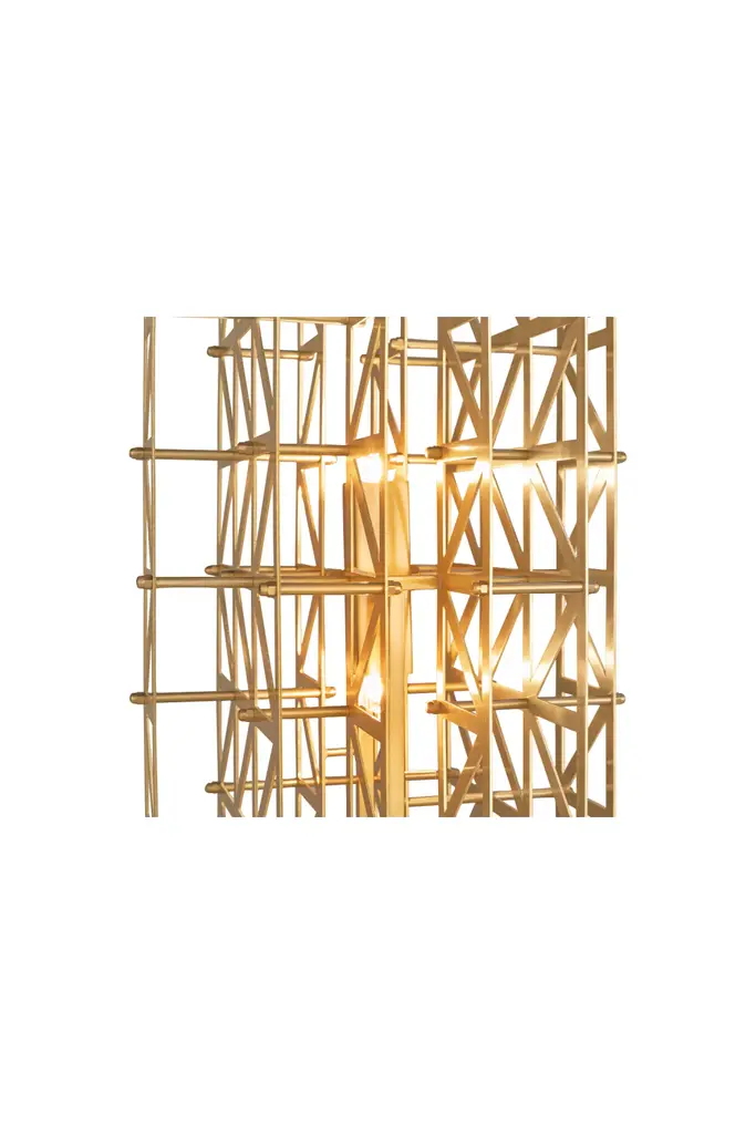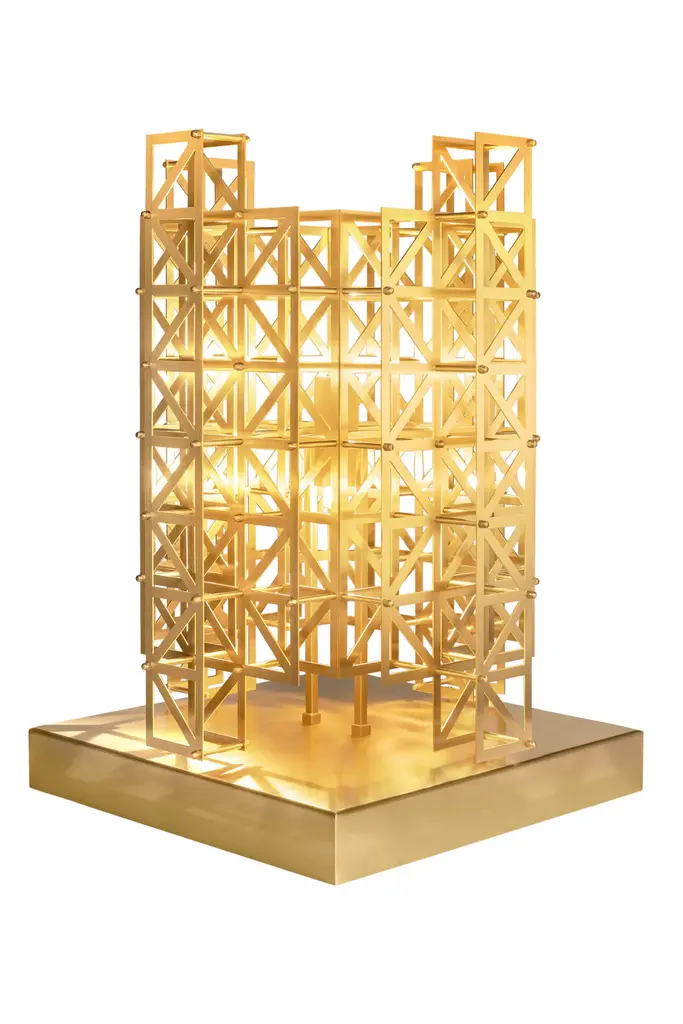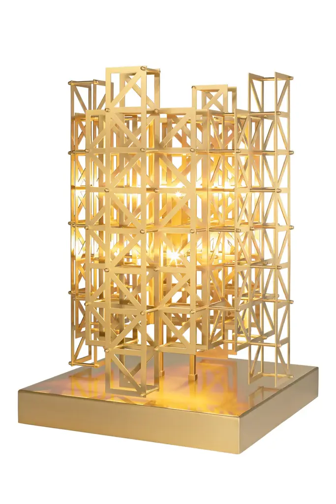 The Pontes Table Lamp by Versmissen, crafted from lustrous brass in a radiant gold finish, showcases meticulous metalwork adorned with captivating crisscross patterns. Place this refined piece on a side table, desk, or shelf to cast a warm, sophisticated glow that highlights the exquisite craftsmanship. Its intricate metalwork creates enchanting shadows, evoking an artistic display.