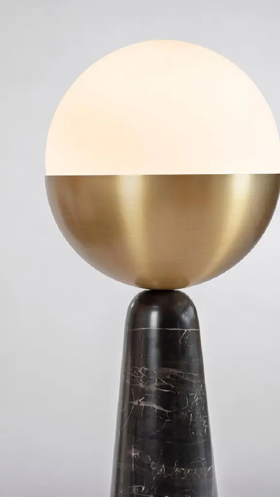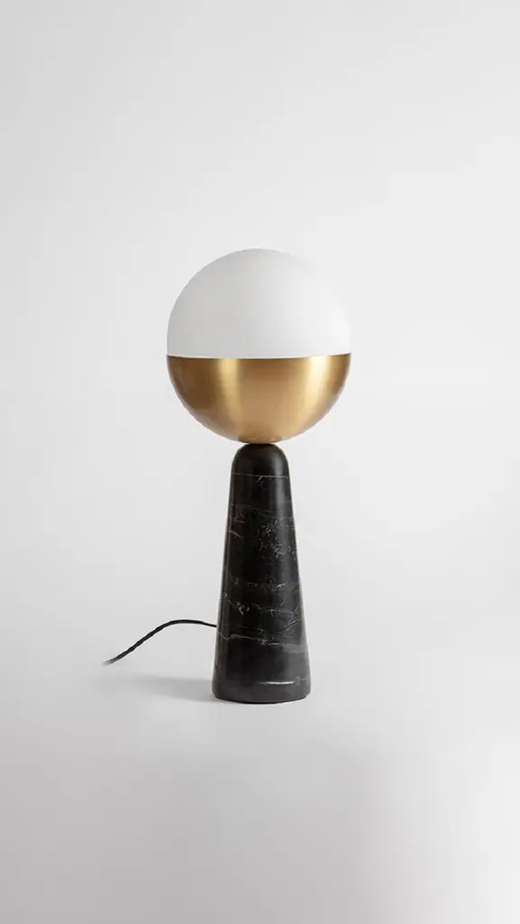 Brass Globe Table Lamp by Square in CircleDimensions: H 60 x W 25 x W 13.5Materials: brushed brass finish, white frosted glass, black marble.Our minimal table lamp has been crafted to ensure its dominating, unabashed globe becomes the centerpiece of any room. At once bold and unassuming, the tapered and rounded black marble base was crafted with brushed brass and an opaque glass shade.Square In Circle is a London-based design studio founded in 2019. The studio explores lighting design in minimal, geometric forms inspired by the Modernist Era. Materials such as marble, metal and glass combine to make each sculptural piece a 'total and complete work of art', as in the manner of Gesamtkunstwerk.All our lamps can be wired according to each country. If sold to the USA it will be wired for the USA for instance.