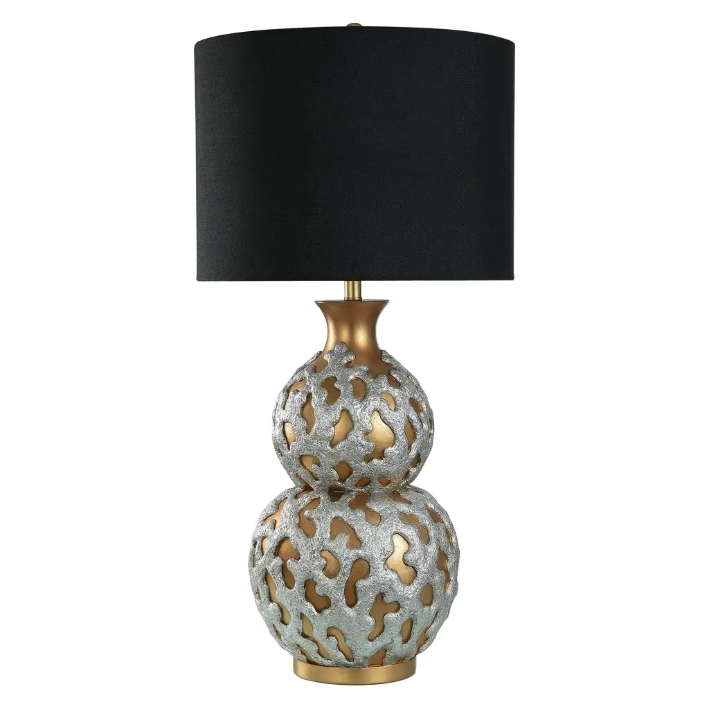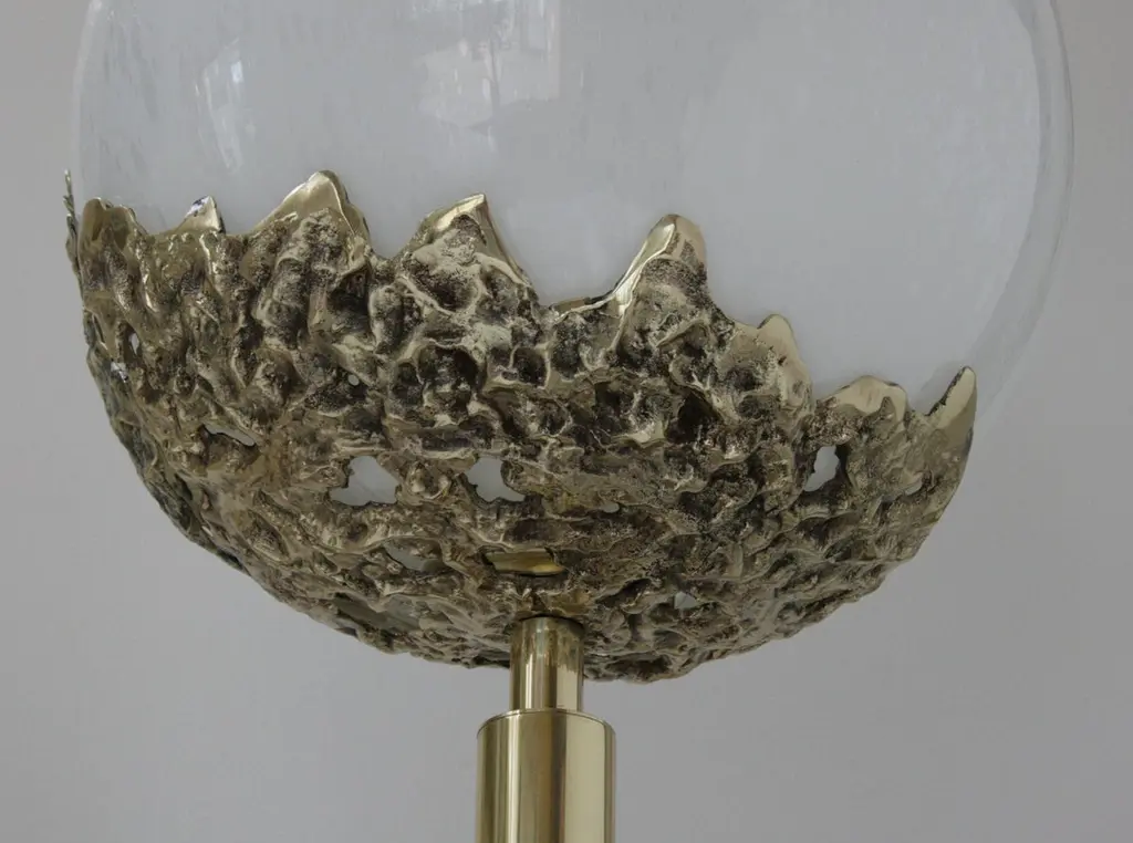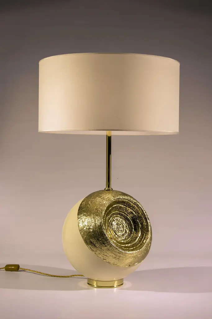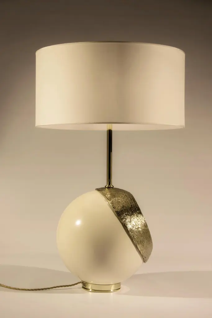 Brass "Herod" table lamp, Angelo BrottoDimensions: 50 x 50 x 86.5cmMaterials: Brass, metalTable lamp with a large base-sculpture in cast brass. The sphere at the base was originally created by Angelo Brotto in 1977 as a table sculpture. The back portion of the sphere is available in a brass version and in ivory or black coated metal versions. Circular ivory-tone shantung shade.