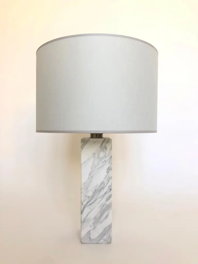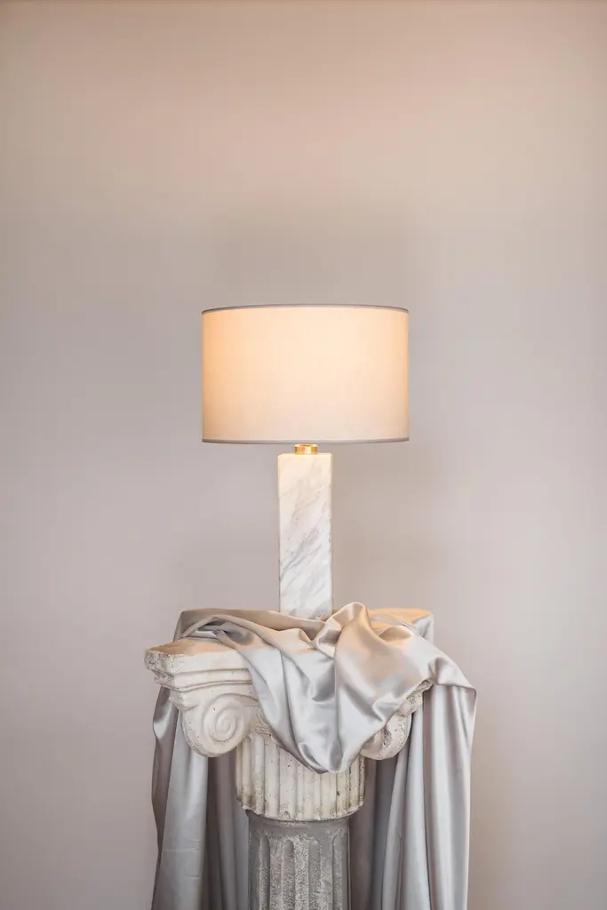 Brass sculpted table lamp by Brajak VitbergATHENS 1.2Materials: Mura marble (also available with Carrara marble), Polished brasswhite or black cotton lampshade, cotton wiringDimensions: 52 x 35 x 35 cmBijelic and Brajak are two architects from Ljubljana, Slovenia.They are striving to design craft elements and make them timeless through experimental designing process.The studio creates a range of products from handmade and limited small series to one piece unique products, inspired by materials and forms that create incomplete perfection.All our lamps can be wired according to each country. If sold to the USA it will be wired for the USA for instance.