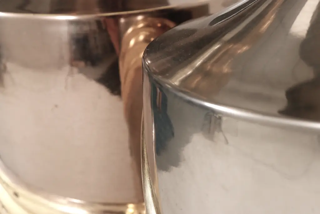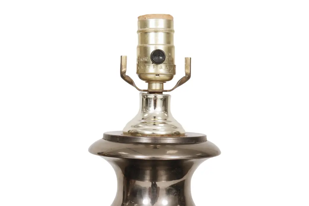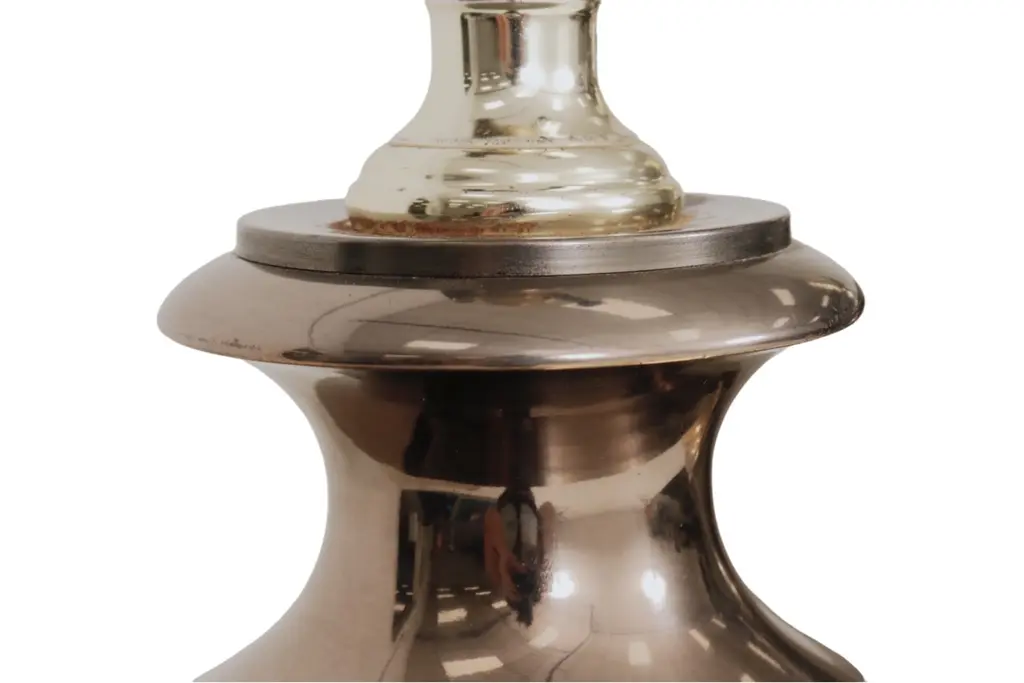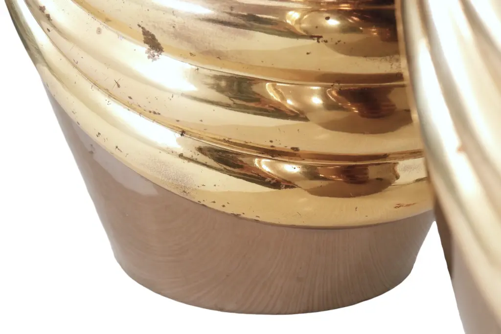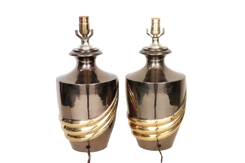 A large pair of Art Deco style urn shaped lamps made of brass, polished to a mirrored finish. Brass sockets are supported on beveled necks that curve down to angular shoulders. Embossed with an elegant swag motif in gold that drapes around the body in a silvered finish.