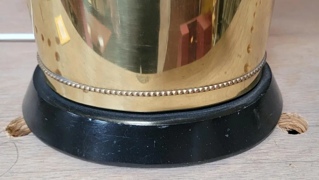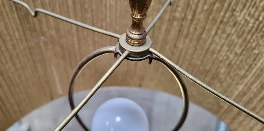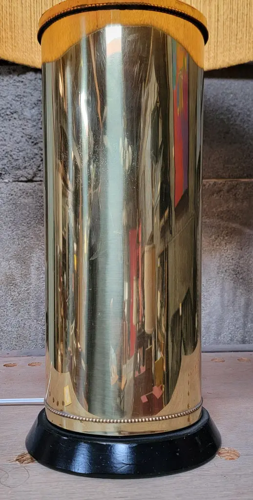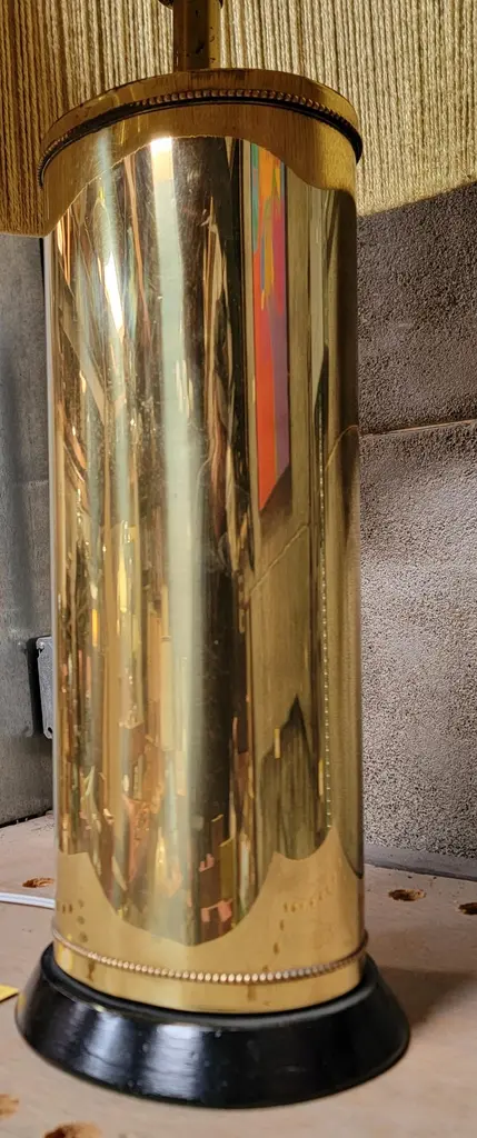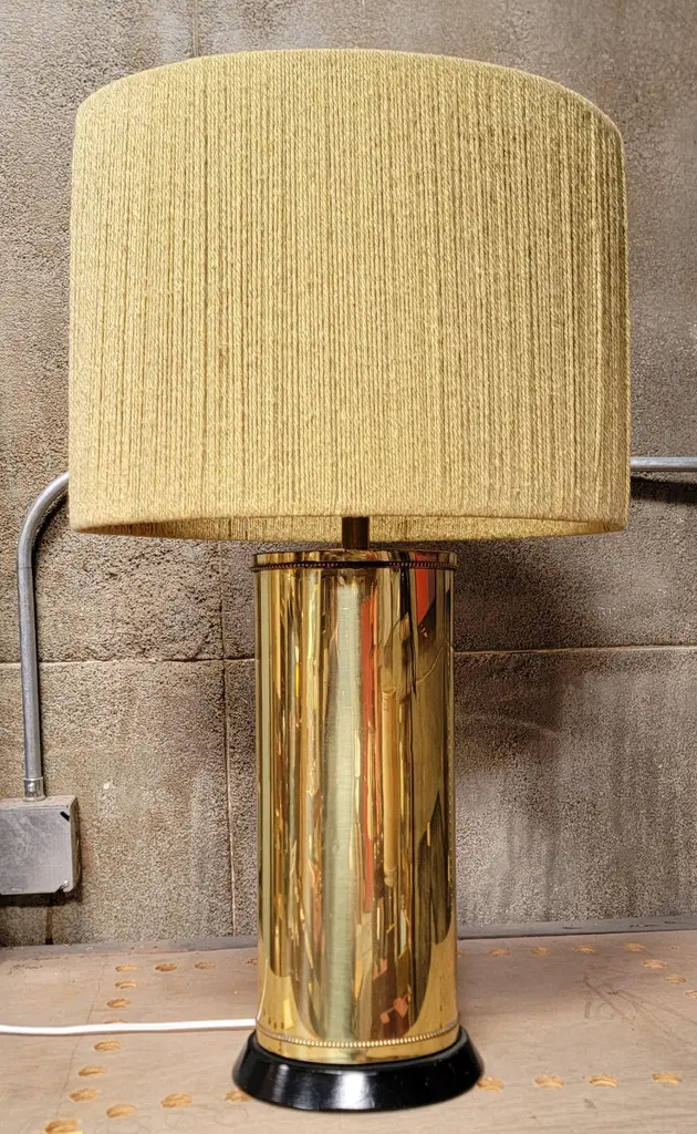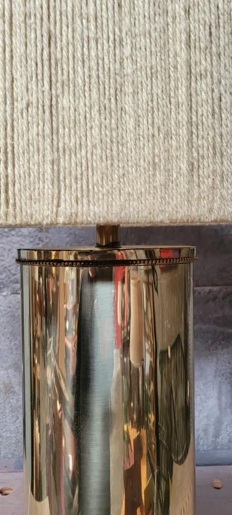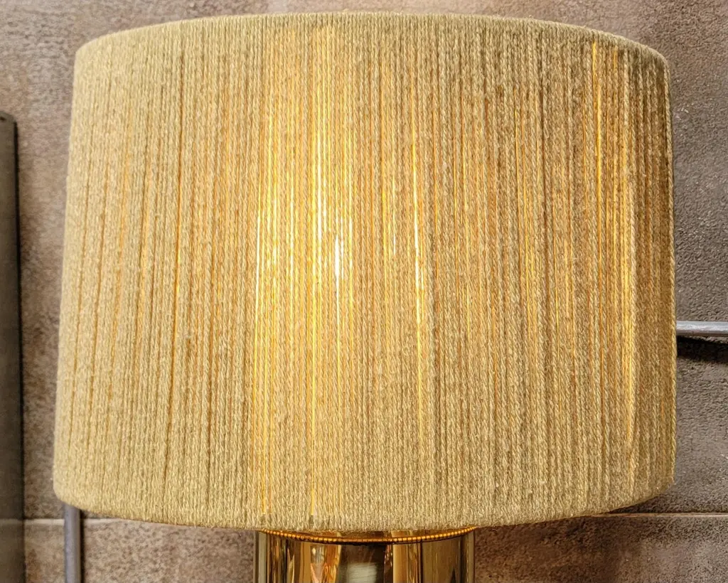Oval brass table lamp with woven yarn lamp shade. Manner of Curtis Jere. Circa. 1970's. 32.25 inches high.19 inches wide.14 inches deep.SHADE19 inches wide.14 inches deep.13.25 inches high.