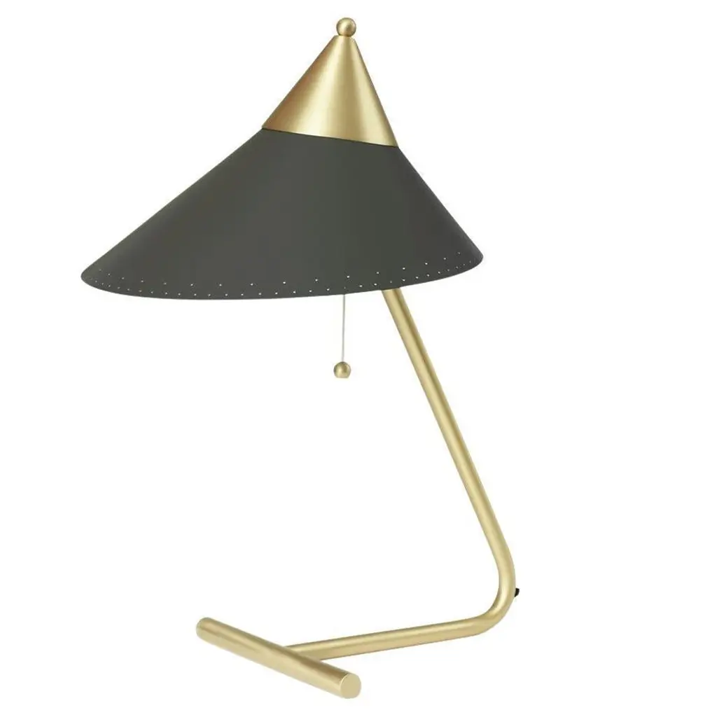 Brass top warm white table lamp by Warm NordicDimensions: D 24 x W 31 x H 41 cmMaterial: Lacquered steel, brassWeight: 1 kgAlso available in different colours.A table lamp with unique, solid brass details, created in the 1950s by the Danish designer, Svend Aage Holm-Sørensen, who is internationally acclaimed for his lamps. The Brass Top table lamp is perfect for a home office with its original design, in which solid brass takes pride of place, from the base and stand to the brass top of the asymmetric shade. The several elegant details include the little ball on the top of the table lamp, which is in harmony with the ball of the power switch, not to mention the light holes along the edge of the metal shade, which were characteristic of both Svend Aage Holm-Sørensen and the era, and which add an extra dimension to the lighting effect. Choose from several classic colours in Warm Nordic's exclusive silky matt quality paint, which guarantees an extraordinarily beautiful and durable surface. Warm Nordic is an ambitious design brand anchored in Nordic design history and with a timeless, aesthetic style that inspires you to appreciate the little things in life. The company is the result of several years’ intense work on developing a new design brand with design history, quality and personality at its core. Warm Nordic boasts a colourful and charming universe of furniture, lamps and accessories full of personality. Our designs encapsulate the Nordic spirit, which in its essence is timeless, inclusive and warm.