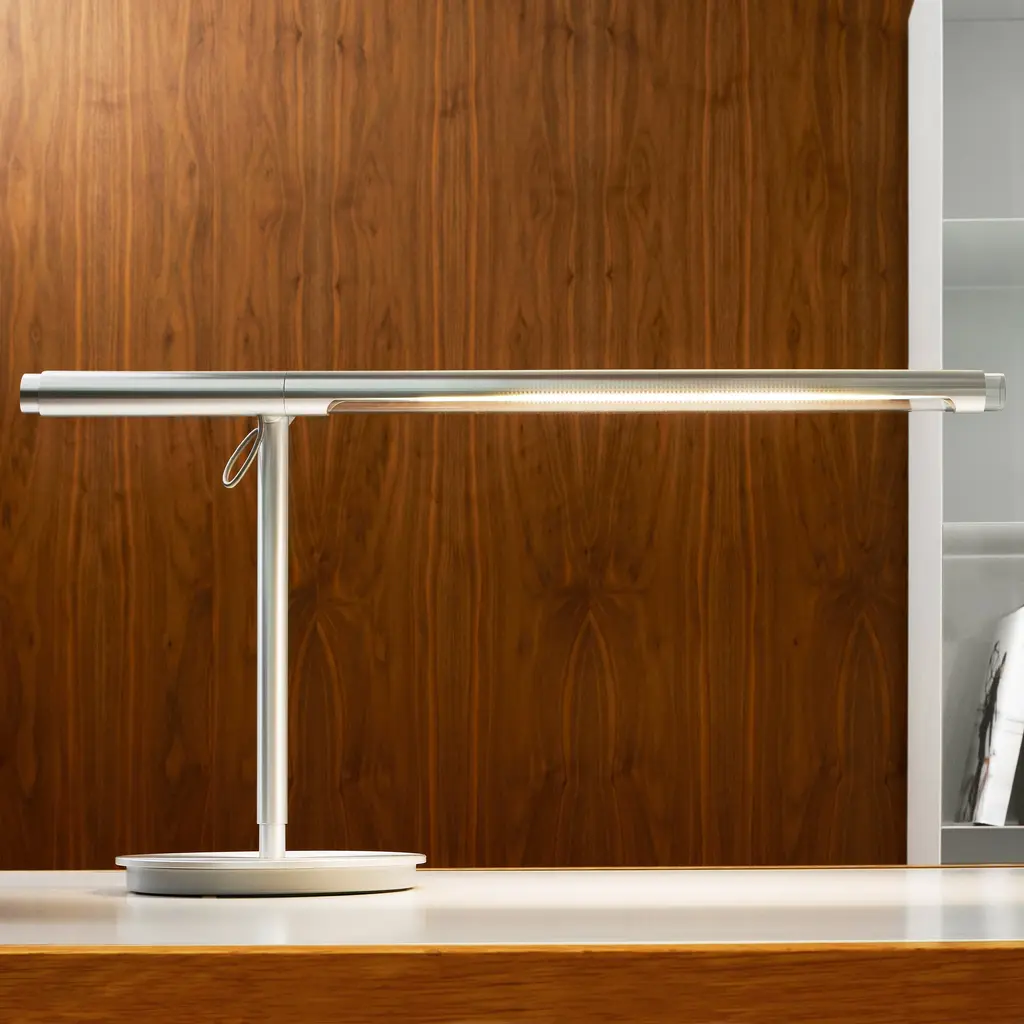 Let's be precise. That's the thinking behind the Brazo Table Lamp from San Francisco's Pablo Designs. Effortlessly, the beam of light can be aimed 360 degrees in any direction by a twist of the aluminum shade. Height adjustable, with arm-tilt range to 90 degrees and finely calibrated light-focus control, Brazo is equal to any task. LED technology provides 50K hours of energy-efficient and maintenance-free illumination and the lamp's materials are 97% recyclable. Not to mention designer Pablo Pardo's corresponding exactitude in conceiving this strikingly linear style.