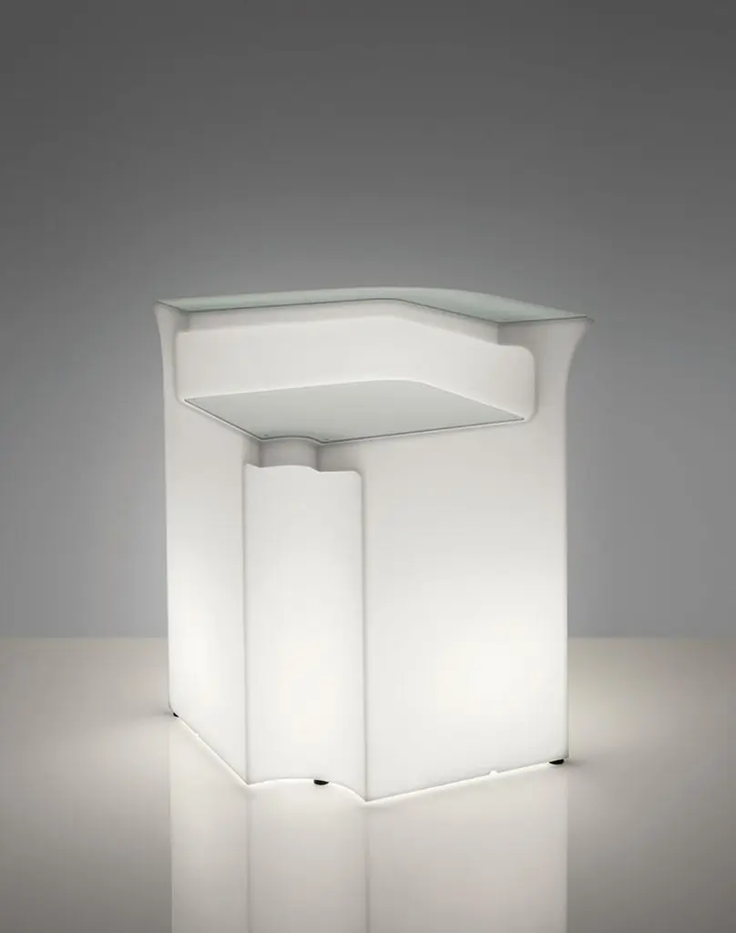 Break Corner Lighted Bar Counter by SLIDE StudioDimensions: D 85 x W 85 x H 110 cm.Materials: Polyethylene and glass.Weight: 40 kg.This product is suitable for indoor and outdoor use. Available in a lighted version. Additional details on glass or steel can be added upon request. Please contact us.Our stories happen in places precious to us. SLIDE was born from the desire to produce furniture and light to create the perfect atmosphere that highlights emotions.Design is inspiration, surprise, joy. It's the amazement of seeing something unique for the first time. It's creating spaces to feel good and live surrounded by beauty. It means giving a personal imprint to indoor and outdoor spaces. It means choosing your ideal element that is the perfect setting for emotions and experiences, which become indelible memories. The founder Giò Colonna Romano knows this well, combining his fervent imagination with thirty years of know-how in the processing of plastic resins, giving birth to SLIDE in 2002. The first note of amazement is the luminous furniture, which immediately became a must have in the world of events. Since 2015, his son Marco Colonna Romano has taken over the reins of the company, with the same desire to grow and innovate as his father. Thanks to a new panache and the team of young people it surrounds itself with, SLIDE becomes a beloved company for outdoor furniture: new shapes, materials and tactile textures have won the hearts and ideas of architects and interior designers around the world. SLIDE has thus created complete collections and furnishings, with new shapes, whose lines arise from collaboration with internationally renowned designers of the caliber of Alessandro Mendini, Paola Navone, Stefano Giovannoni, Fabio Novembre, Marcel Wanders, Karim Rashid, Marc Sadler, Francesco Favaretto and Marcantonio.New materials were chosen and inserted, initially soft and rigid polyurethane, and then comfortable cushions, waterproof fabrics, tactile textures ideal for completing the polyethylene furnishings with taste and class. But SLIDE does not forget its first essence, lighting: in recent years it has developed a line of much more technical lamps for large areas, essential in shape but with great visual impact. For the first time, Slide has managed to give an artisanal twist to an industrial process: to meet the increasingly high demands of living, the production creates non-replicable shades, in which every small imperfection enhances the industrial process and makes each piece unique . Because Slide's strength has always been the careful reading of the market, the creation of something that didn't exist and which then became necessary: here Slide continues its production in Buccinasco, on the outskirts of Milan, but its name and its products reach more than 130 countries around the world.