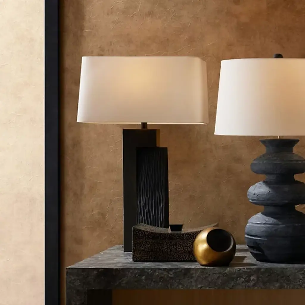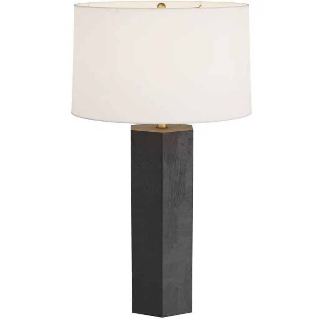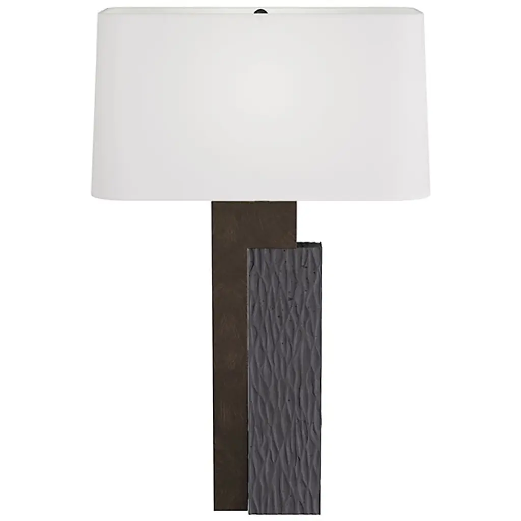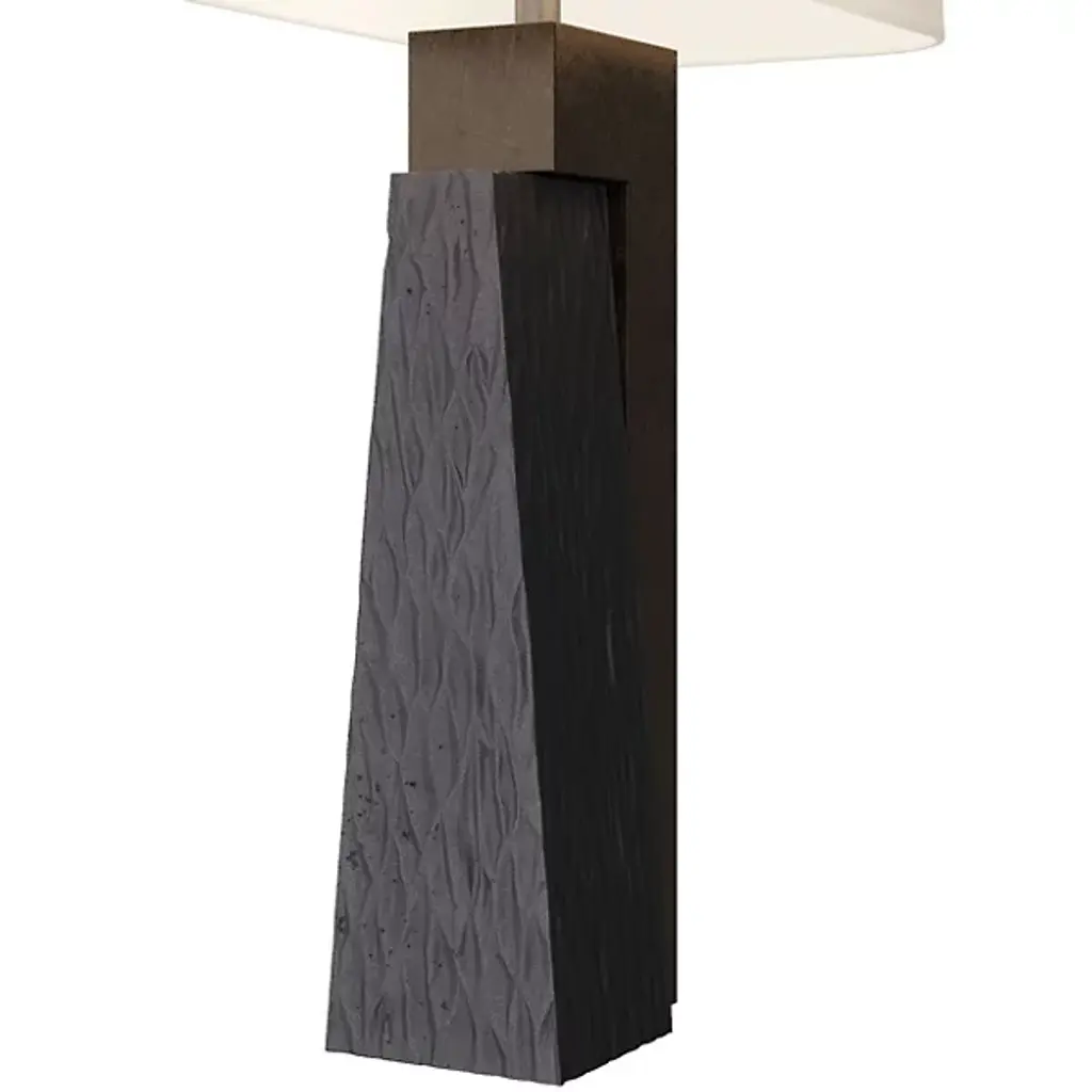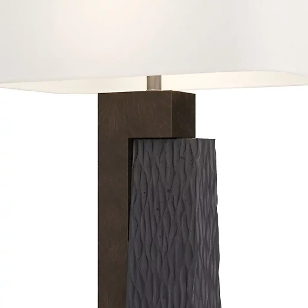 The Briarwood Table Lamp from Arteriors captivates with powerful shapes crafted from charcoal ricestone composite and English bronze-finished steel, forming a compelling contemporary sculpture for your home. Its angular lines are accentuated by a rectangular drum shade of off-white microfiber lined in cotton, creating a striking visual impact. Topped with a bronze finial and finished with a black cloth cord, this chandelier exudes sophistication. With a three-way rotary switch, its finish varies, adding a unique touch to each piece, Bridging the gap between Transitional and mid-century modern styles, and making a bold artistic statement.