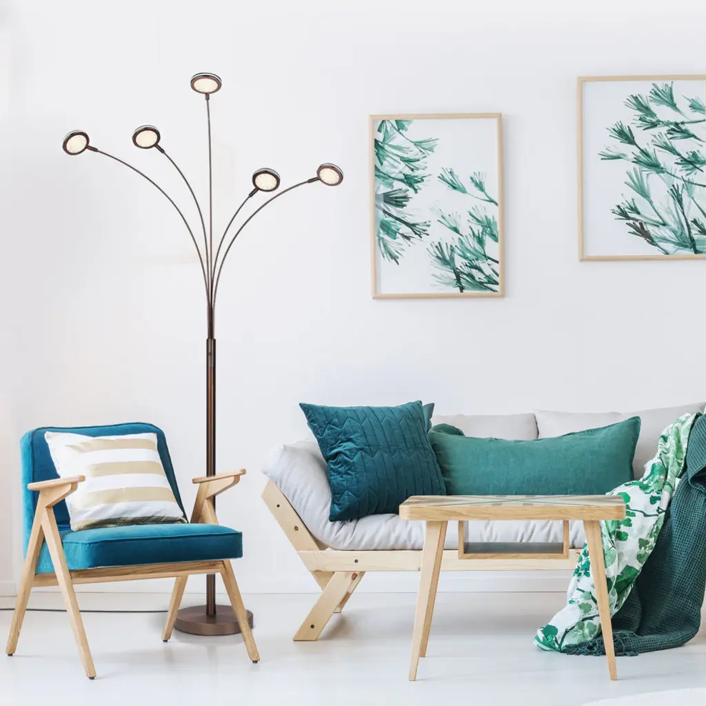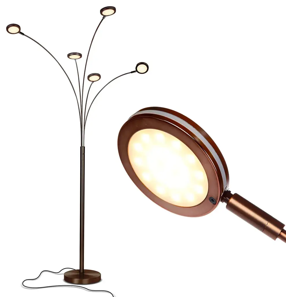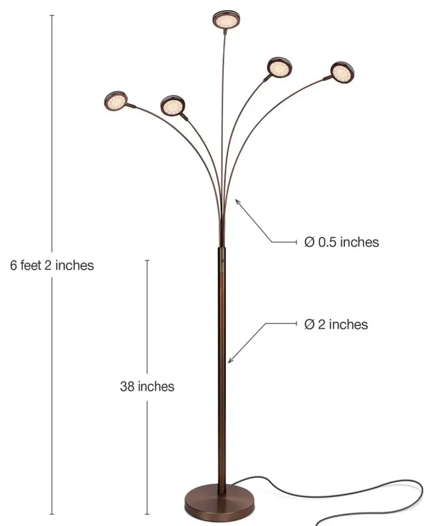 LARGE, MODERN LED POLE LAMP WITH ARCHING ARMS EARNS COMPLIMENTS & SUITS VARIOUS DECOR THEMES - The contemporary Brightech Orion 5 is a multi-head conversation starter that earns visitors'' admiration. Match it to modern, urban, minimalist, and contemporary living rooms, bedrooms, and offices. Use it to light large rooms with a lamp that has a presence.TALL STURDY STANDING ARCHED LAMP - PERFECT TO OVERHANG A COUCH - 5 INDIVIDUALLY ADJUSTABLE HEADS & ARMS - Position the Brightech Orion lamp in a corner with its heavy anti-tipping base under a sofa or behind it, and fan out the arms in a tight or wide group. Point the hinged light heads - with a wide range of motion - at the sofa and the rest of the room. Useful in small and large rooms, with arms varying in height between 5 ft 5 in, to 6 ft 3.STYLISH, SUPER BRIGHT INDOOR LAMP FOR OFFICE READING, TASKS & RECEPTION - With a very high 2250 lumens (450 x 5 heads), the Brightech Orion gives you light intensity like a 200-watt halogen lamp, making reading easier for your customers or yourself. Stand it up in a reception area or over your desk.STURDY, HEAVY LAMP CUTS YOUR ENERGY BILL: The Brightech Orion features a heavy base so it doesn''t tip even with kids and pets running around. Its power-saving LEDs draw 22.5 watts, instead of 200 watts for comparable brightness halogen floor lamps. And the LEDs last 20,000 hours; you never have to replace a bulb. Light color: 3,000K warm white.BRIGHTECH''S SATISFACTION GUARANTEED WARRANTY: We proudly stand behind all of our products 100%, which is why we offer a full 3-year warranty. If for any reason you are not satisfied with your purchase, please contact us because our number one goal is customer satisfaction and we are committed to making it right for you. Applies to products bought from Brightech (not just Brightech branded) in new condition.