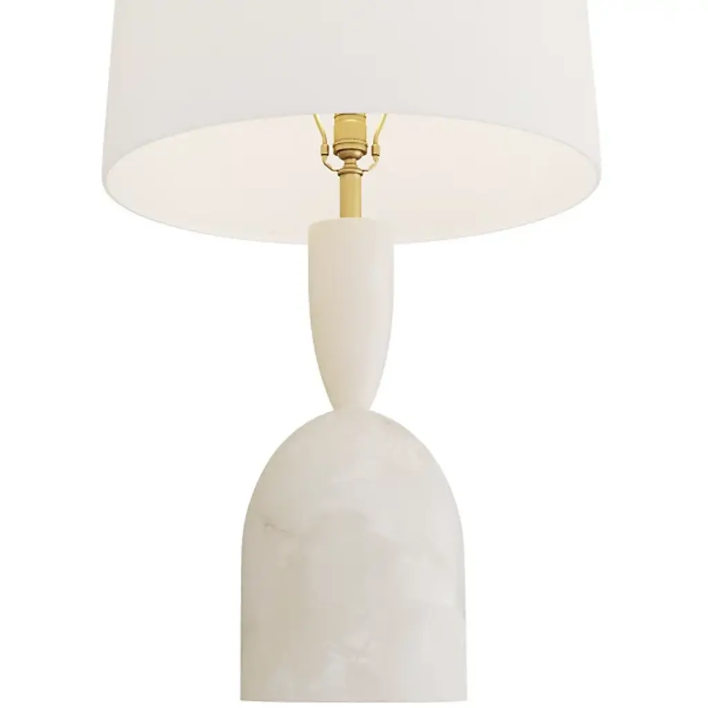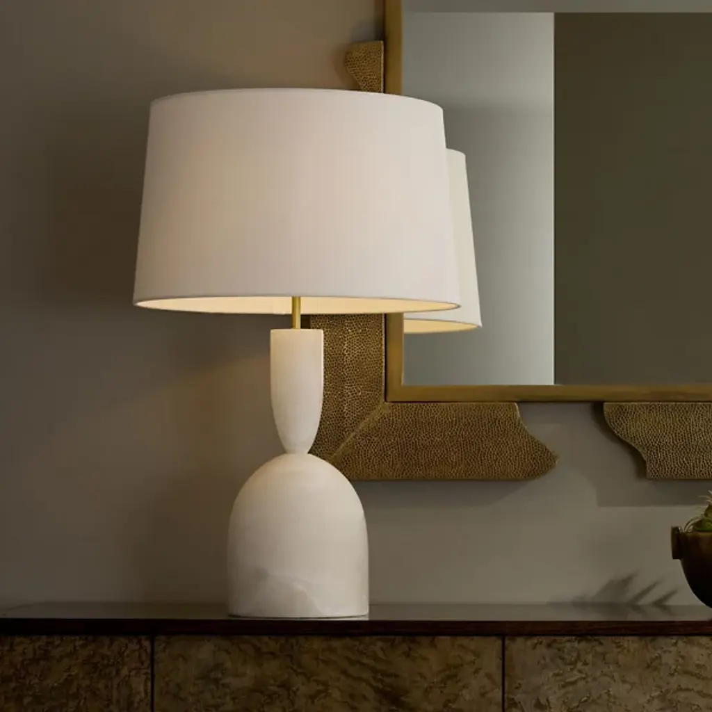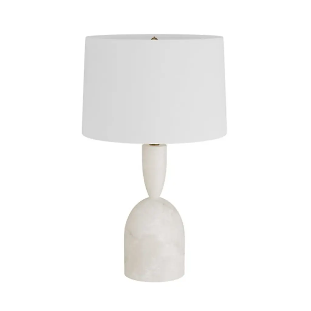 Experience the timeless elegance of the Brighton Table Lamp from Arteriors, where geometric alabaster forms delicately balance to form a graceful silhouette. This feminine masterpiece features a stacked base leading to an off-white linen shade, its tapered design perfectly complemented by matching cotton lining. The antique brass finial adds a refined touch, while the taupe cloth cord and three-way rotary switch ensure both sophistication and functionality in your space.