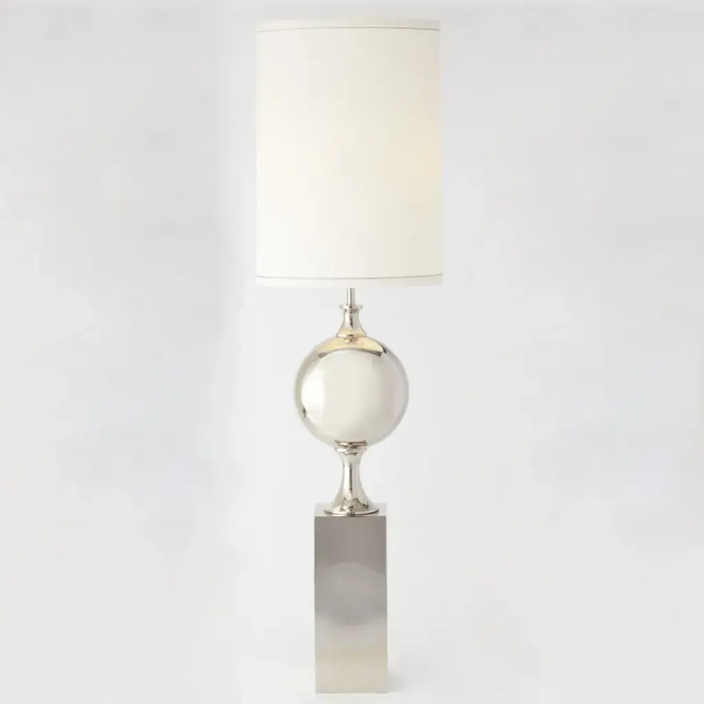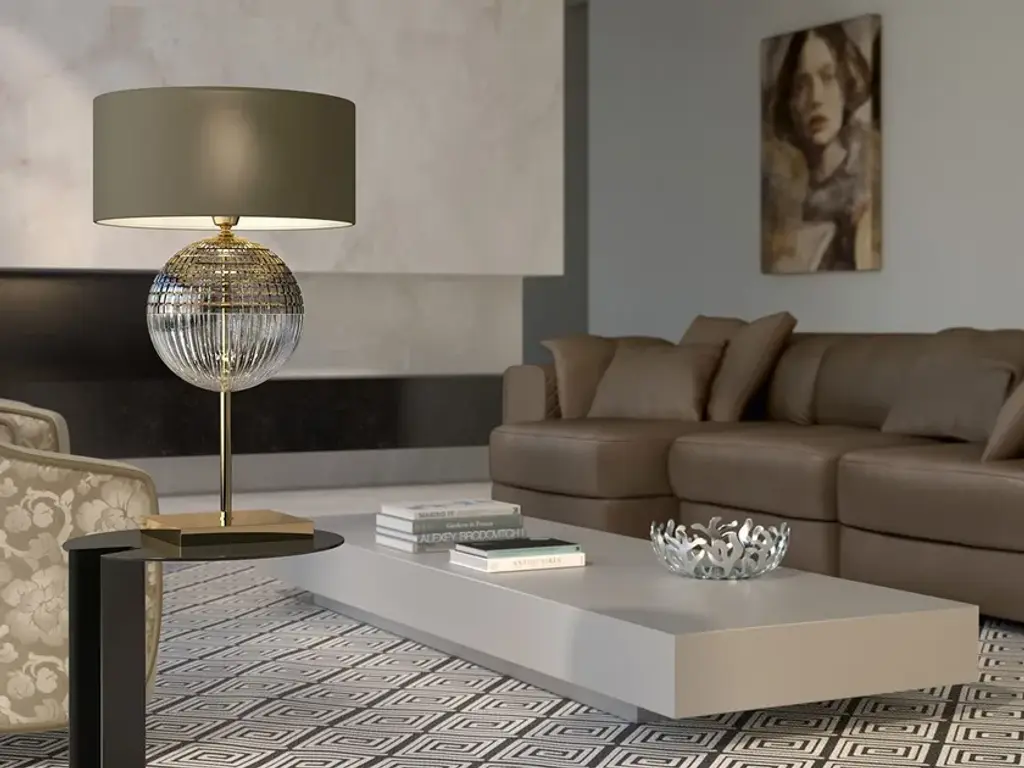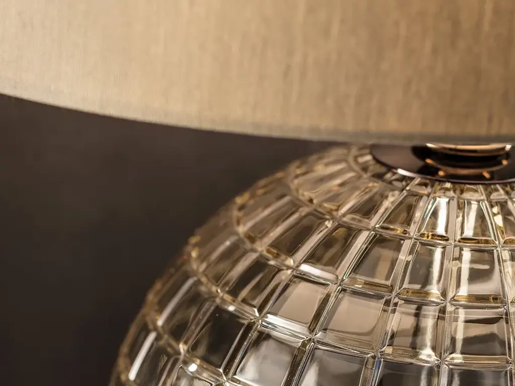 Brigitta is a table lamp with indirect light, a piece that thanks to its elegant design is able to decorate any environment. It is characterized by a squared metal base with a nickel gold finish, enhanced by clear carved glass and teak, while the diffuser is made of taupe fabric.Electrical and technical characteristics8160/LP - -Ø30LED: 1x6w - E14Fluorescent lamp (Energy saving): 1x15w - E14Voltage: 230 VEnergy class: A > A++IP20Certifications: CE/EAC8160/LG -Ø38 LED: 1x13w - E27Fluorescent lamp (Energy saving): 1x20w - E27Voltage: 230 VEnergy class: A > A++IP20Certifications: