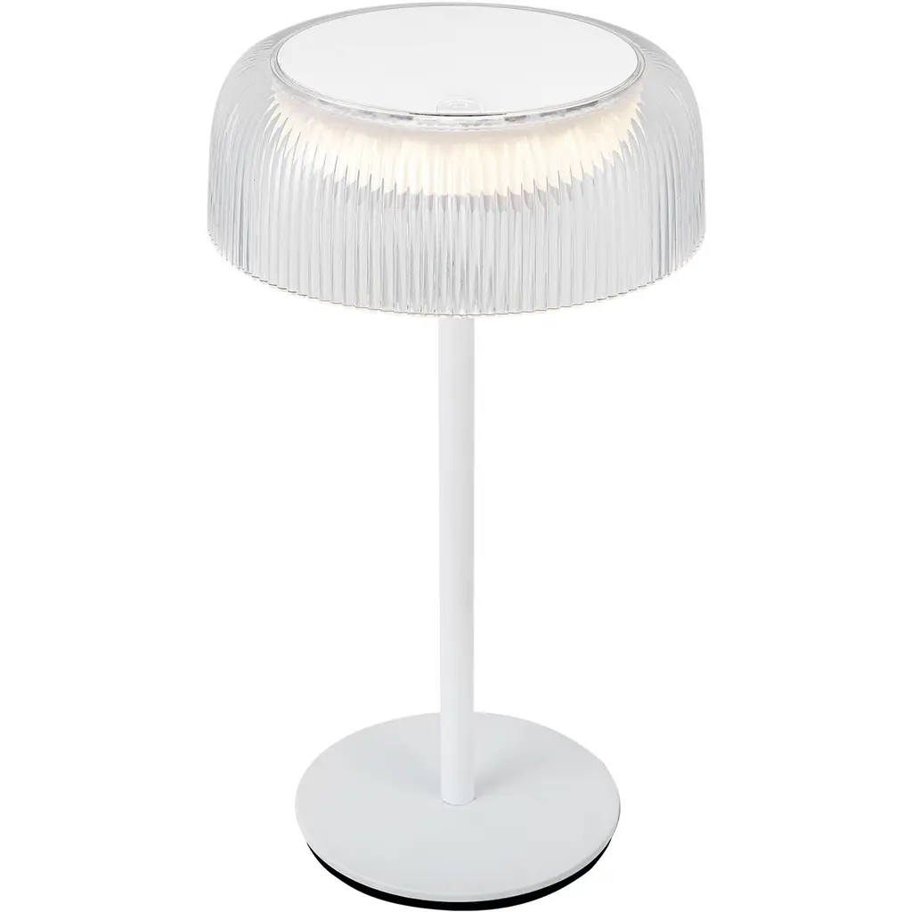 Brilla brings brilliance and convenience together seamlessly. Adorned with a ribbed acrylic shade reminiscent of glistening crystals, it exudes sophistication in every glow. Available with sleek black or white hardware accents, this rechargeable lamp is your versatile beacon of style.