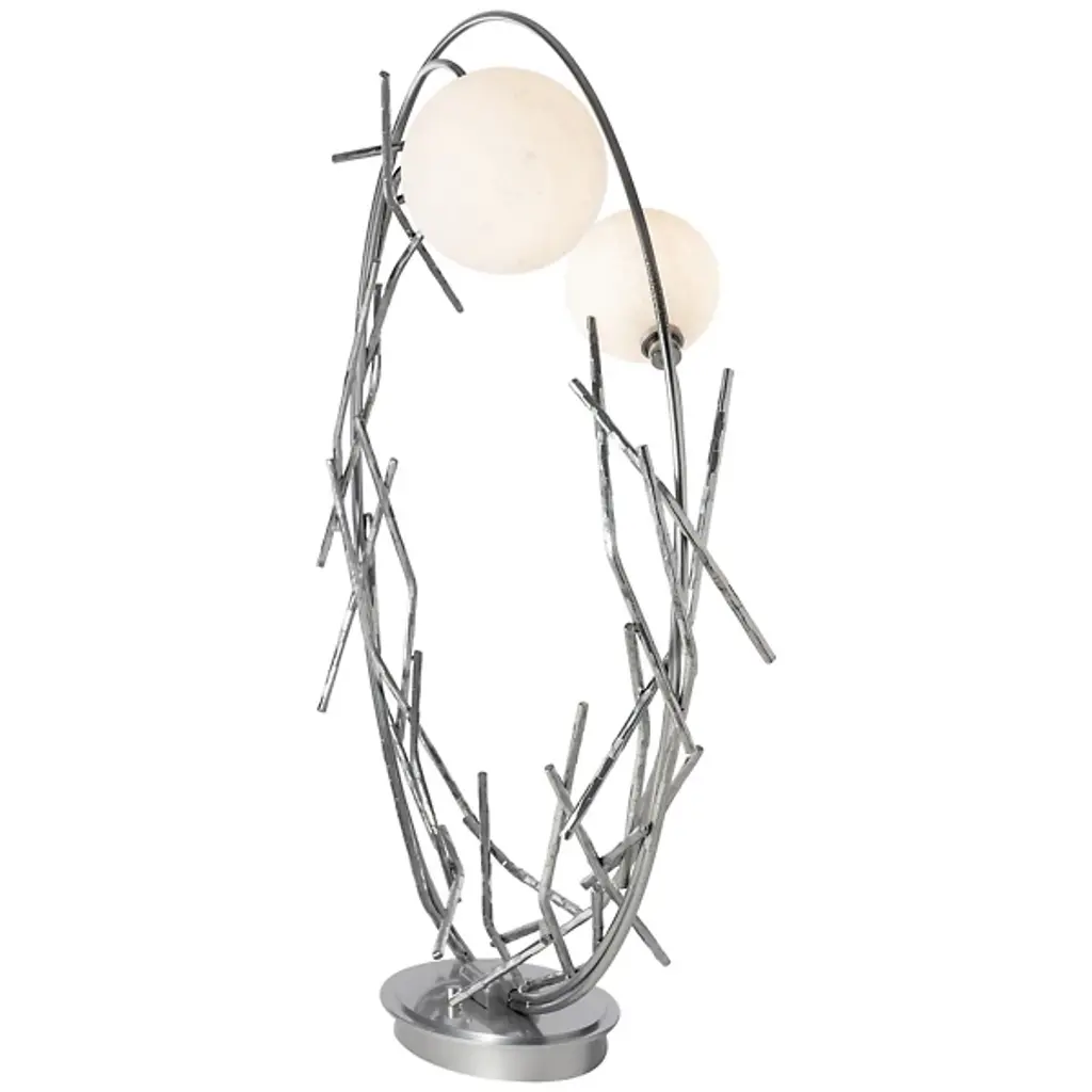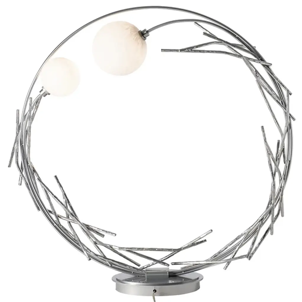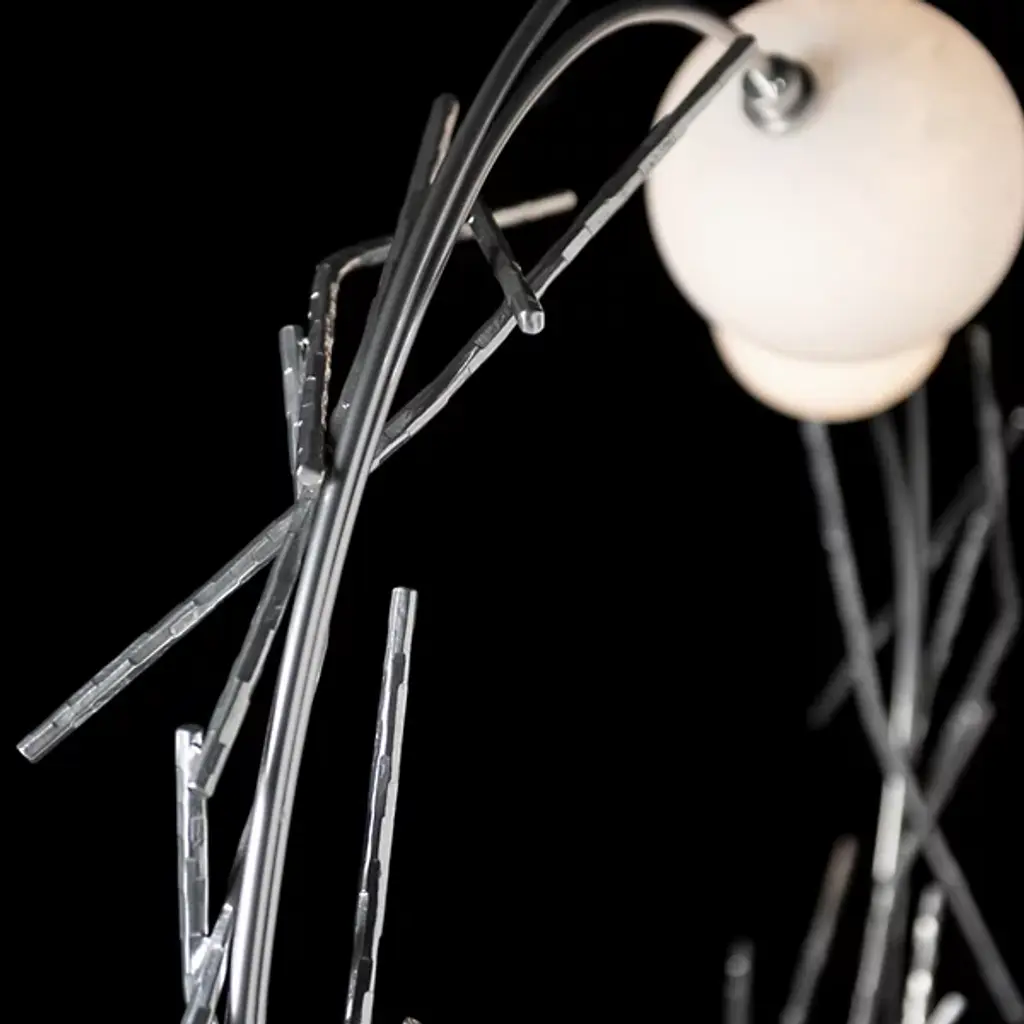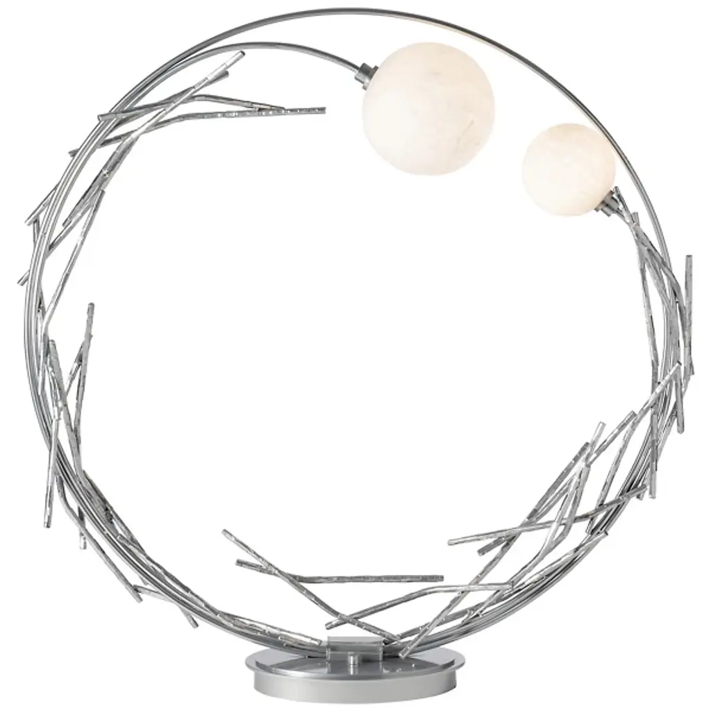 Whether up on a console table or down on the floor, the Brindille Ring Table Lamp by Hubbardton Forge offers eye-catching sculptural appeal. This large-scale lamp is a naturally dramatic accent for a modern interior, with numerous hand-hammered steel “twigs” that are arranged in an overlapping configuration around a wide round ring, forming a kind of rustic metal wreath. Near the top, 2 gleaming glass globes highlight the details of the surrounding frame and provide plentiful ambient light.