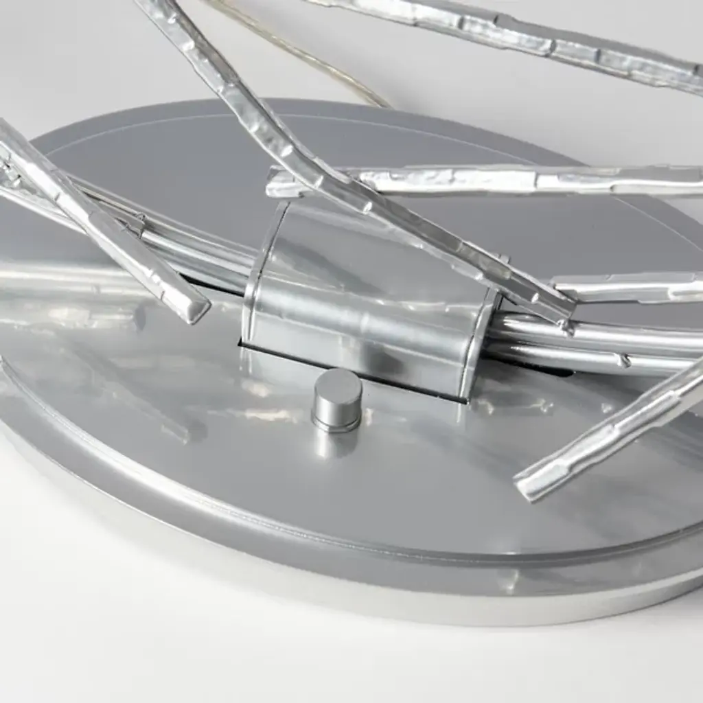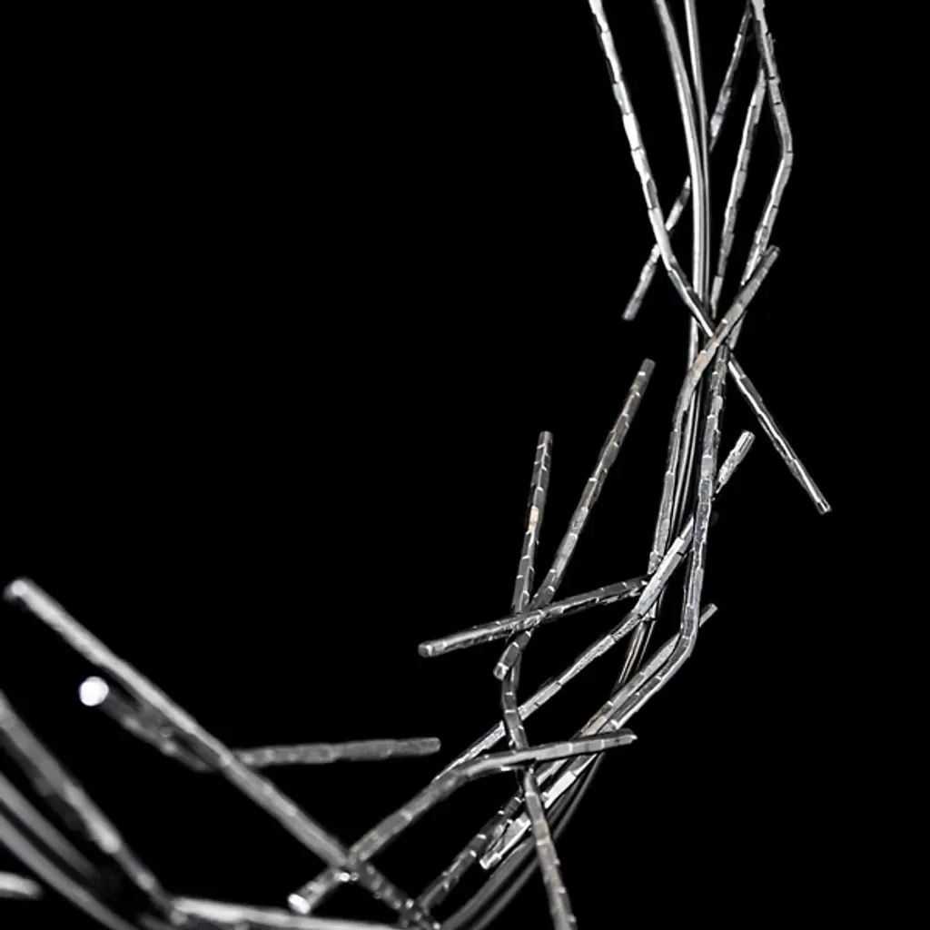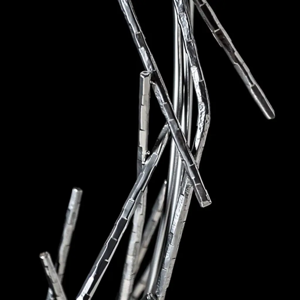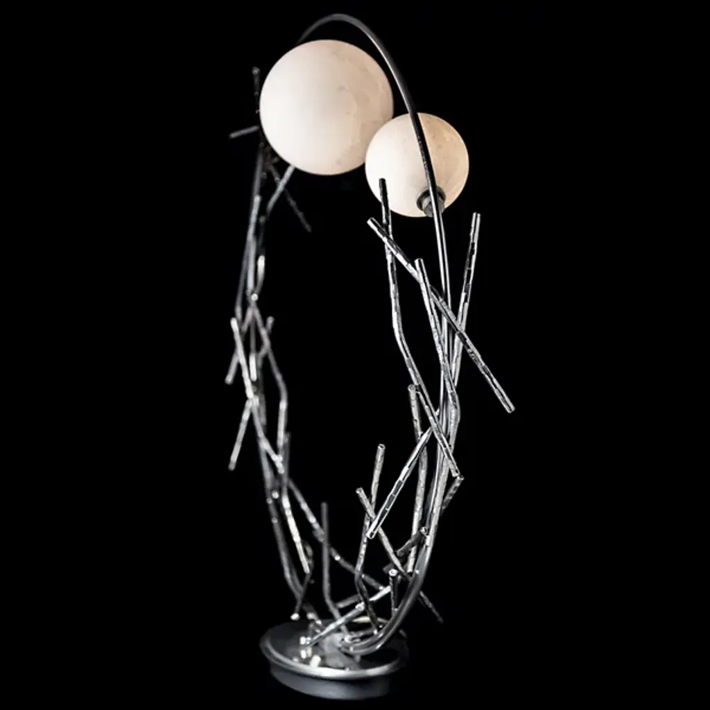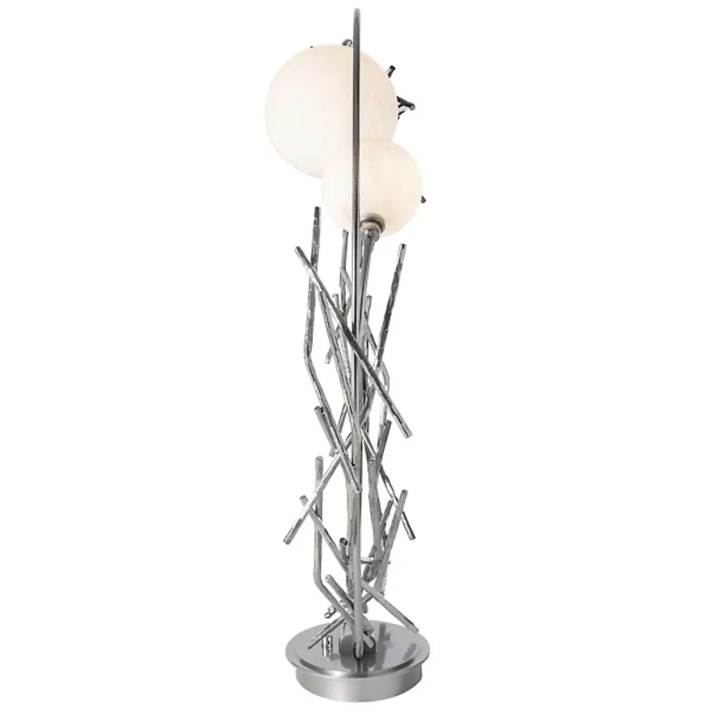 Whether up on a console table or down on the floor, the Brindille Ring Table Lamp by Hubbardton Forge offers eye-catching sculptural appeal. This large-scale lamp is a naturally dramatic accent for a modern interior, with numerous hand-hammered steel “twigs” that are arranged in an overlapping configuration around a wide round ring, forming a kind of rustic metal wreath. Near the top, 2 gleaming glass globes highlight the details of the surrounding frame and provide plentiful ambient light.