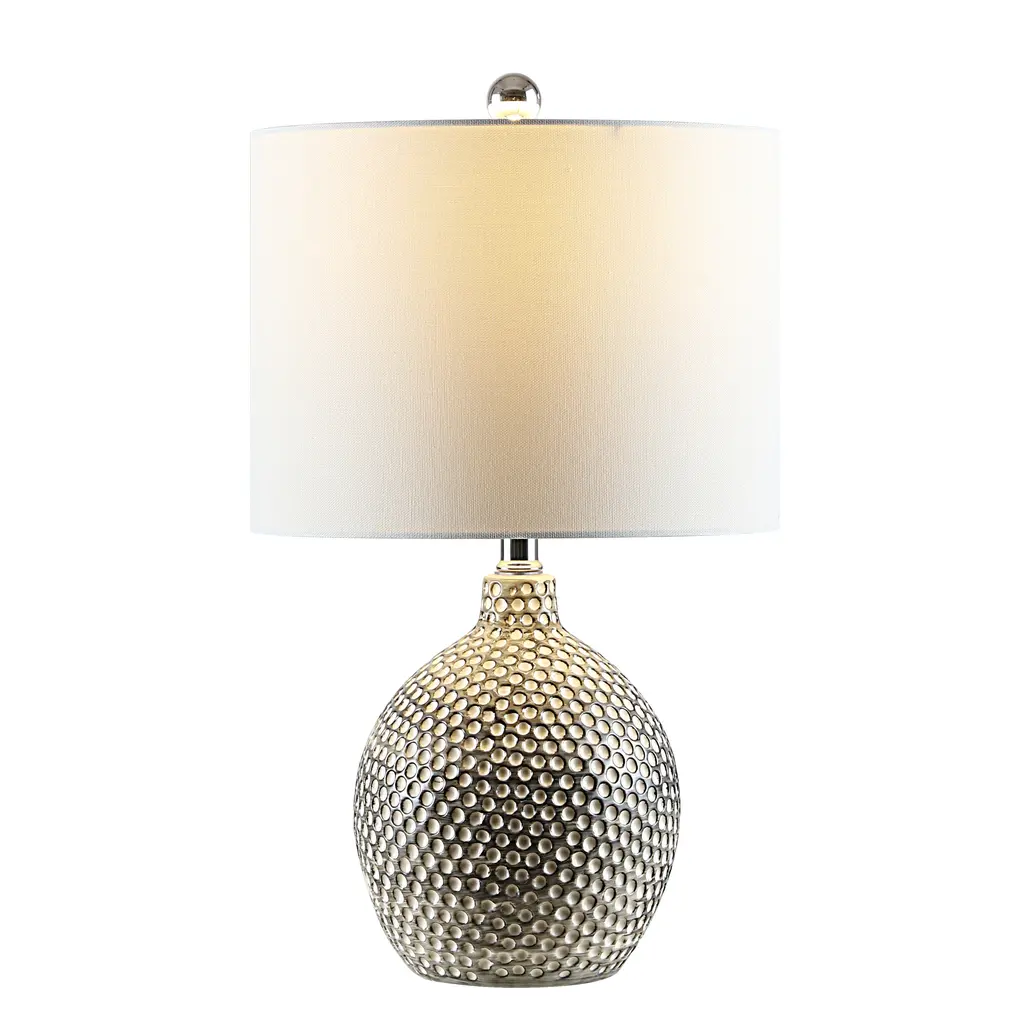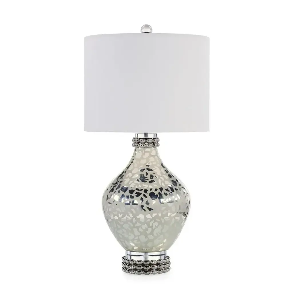 The Brisa Table Lamp is a stylish, contemporary piece that displays tasteful use of negative space. The piece features a variety of abstract shapes cut into the glass body, creating gorgeous flourishes that greatly elevate a space. The piece sits atop a two-tiered base of clear acrylic and brass spheres in a Nickel finish, matched by the neck accent. The look is completed by an acrylic ball finial and white drum shade.