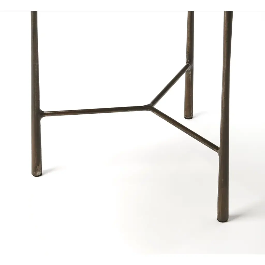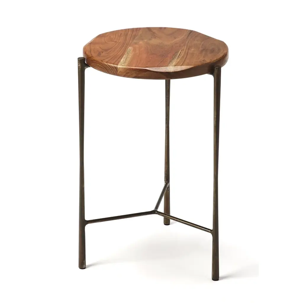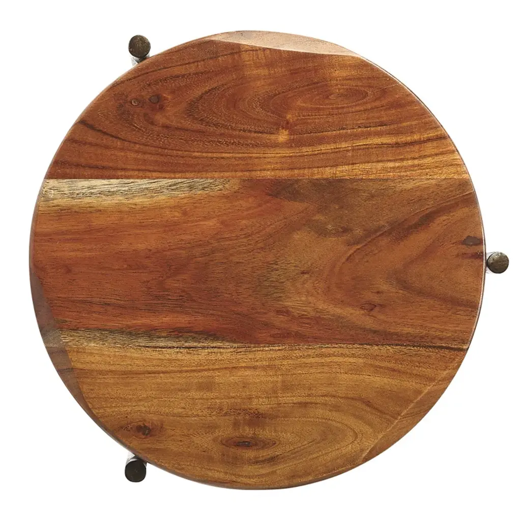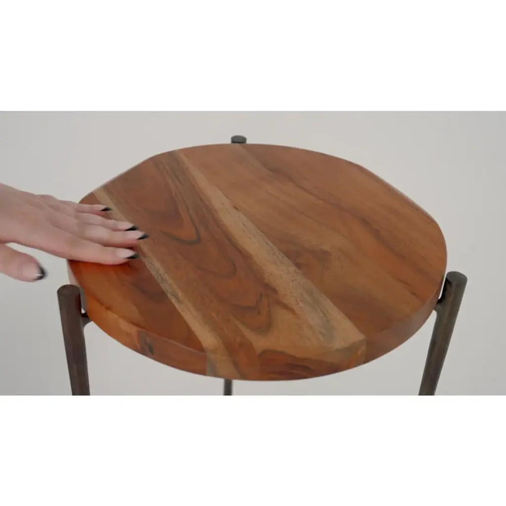 Our round end table features a solid acacia wood top with a purposefully distressed grain accent and a sleek black iron base. The three-leg design adds a bit of modern flair to your space, while the variations in the wood means each piece is unique. It can hold up to 20 lbs., so this side table is perfect for displaying your favorite lamp, potted plant, or framed photos. With a minimal footprint, it's an ideal choice for smaller living rooms or entryways.