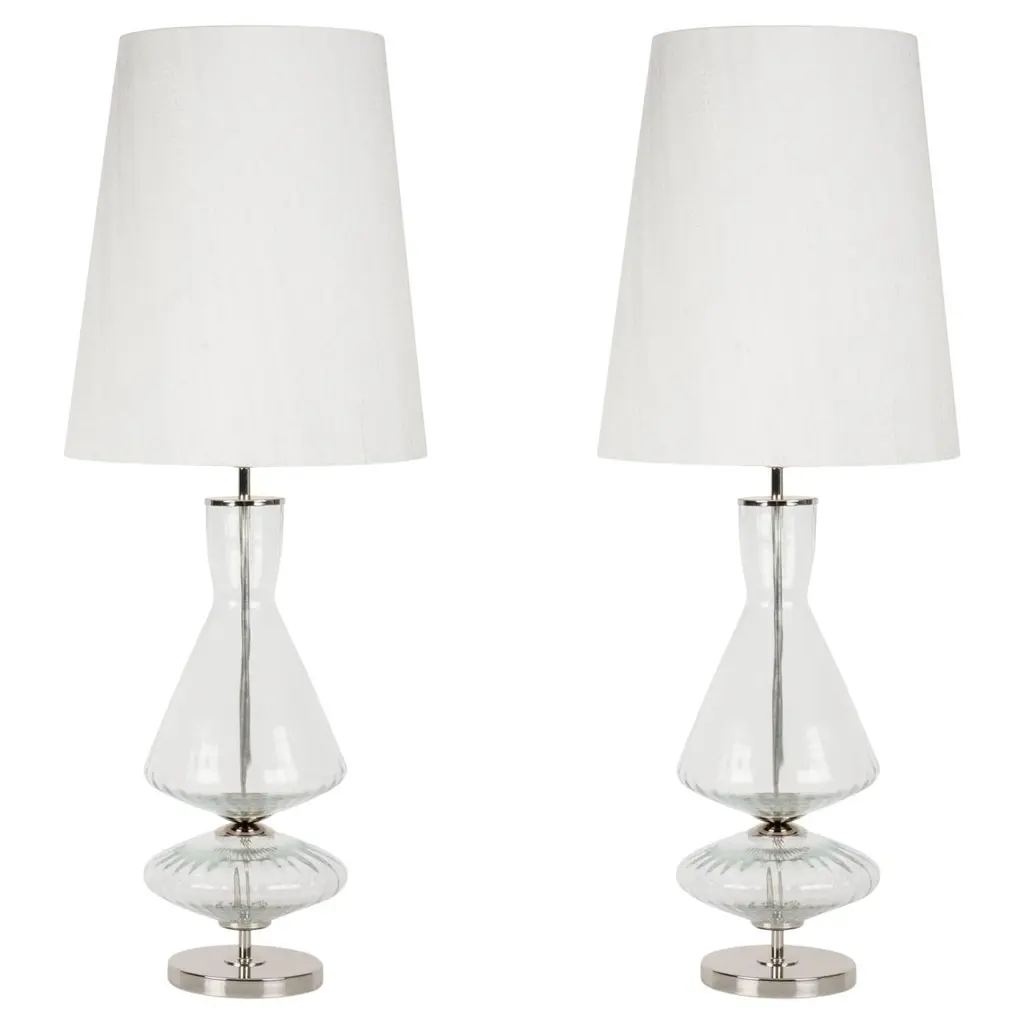 Introducing the Brisor 22 inch clear glass table lamp set of 2, a perfect blend of elegance and simplicity for your living space. These striking lamps feature a sleek and transparent glass base that complements any decor style effortlessly. The clear construction allows these lamps to add a touch of airy lightness to your rooms, making them an ideal choice for those seeking to enhance their home with subtle sophistication. Perfect for bedroom nightstands or living room end tables, the Brisor lamp set provides ample light while also serving as a stylish focal point. The understated design ensures that these lamps fit seamlessly into both modern and traditional interiors. Whether you're curling up with a book or setting the mood for a relaxing evening, the Brisor lamps offer the perfect ambiance. Illuminate your space with elegance and enjoy the refined presence these lamps bring to your home.