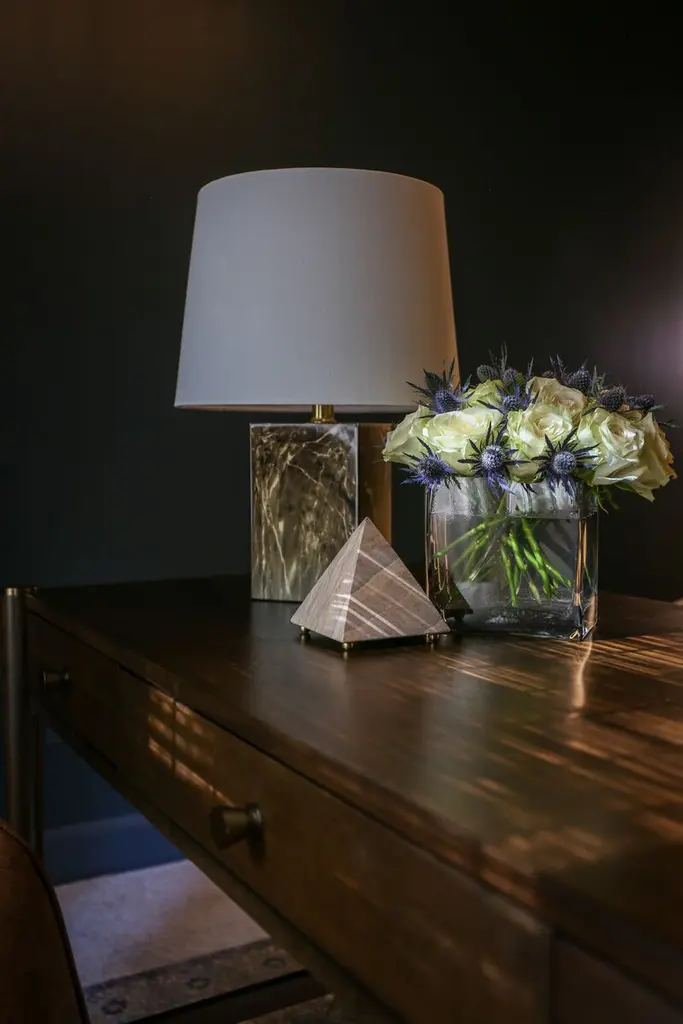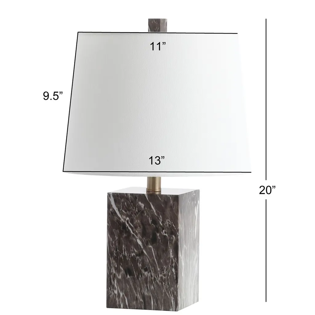This table lamp's body, a rectangular prism, boasts a marble finish that gives it timeless sophistication. The crisp cotton shade adds to the tailored elegance.