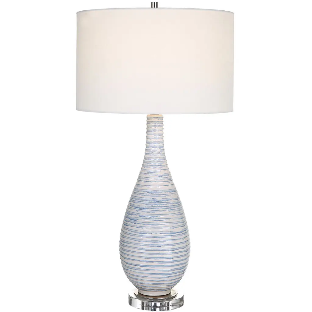 The Brizi Table Lamp combines cream and blue ceramic for a charming coastal-inspired design. Topped with a white drum shade, it radiates a modern aesthetic that effortlessly complements any interior. Its soothing hues and sleek silhouette evoke a sense of tranquility and sophistication, making it an ideal choice for any space.Features:Cream and blue ceramic base for a coastal inspired designWhite drum shade adds a modern touchSoothing hues and sleek silhouette evoke tranquilityBulb Type A required, not includedEasy assembly - just attach harp, finial and shadeRequires 1 Standard A19 E26 Replaceable LED (100 max wattage) ( Not Included)