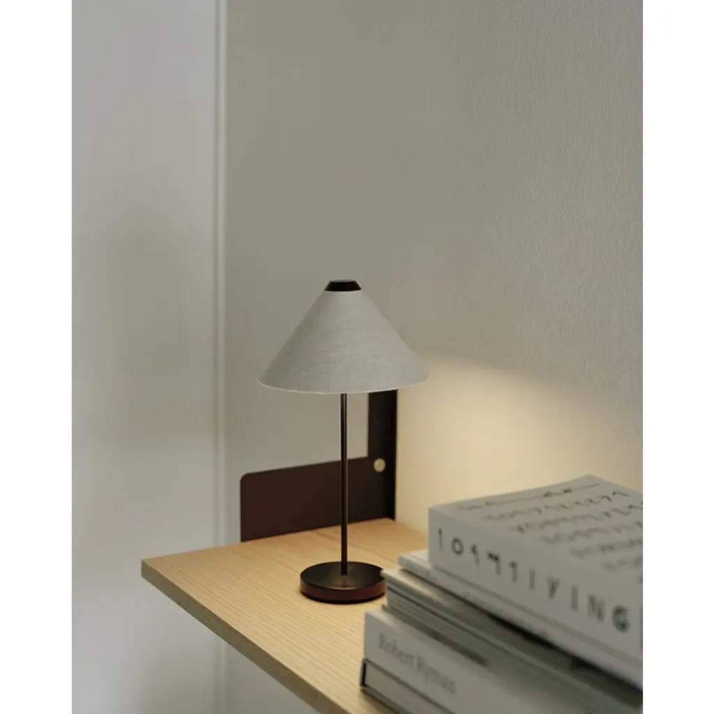 New Works' portable Brolly table lamp, designed by Knut Bendik Humlevik, pairs a delightfully classic esthetic with modern technology. Brolly's cone-shaped lampshade is supported by a slender metal stem, and the integrated and dimmable LED unit casts soft, glare-free light downwards. Thanks to its cordless design, the Brolly lamp can easily be placed wherever needed. It serves as a convenient reading light on a bedside table, sets a cozy ambience on a windowsill, or acts as an elegant table lamp even at the center of a dining table. On the top of the shade is a touch dimmer switch, which allows you to adjust the brightness in three levels. Brolly provides up to 15 hours of light on a single charge, and you can charge the portable lamp with its magnetic USB cable even when the light is on.