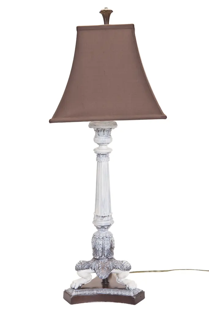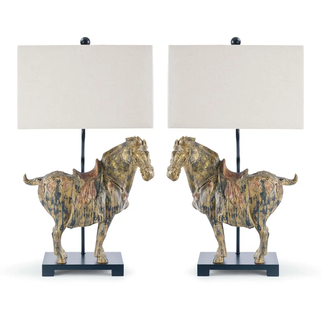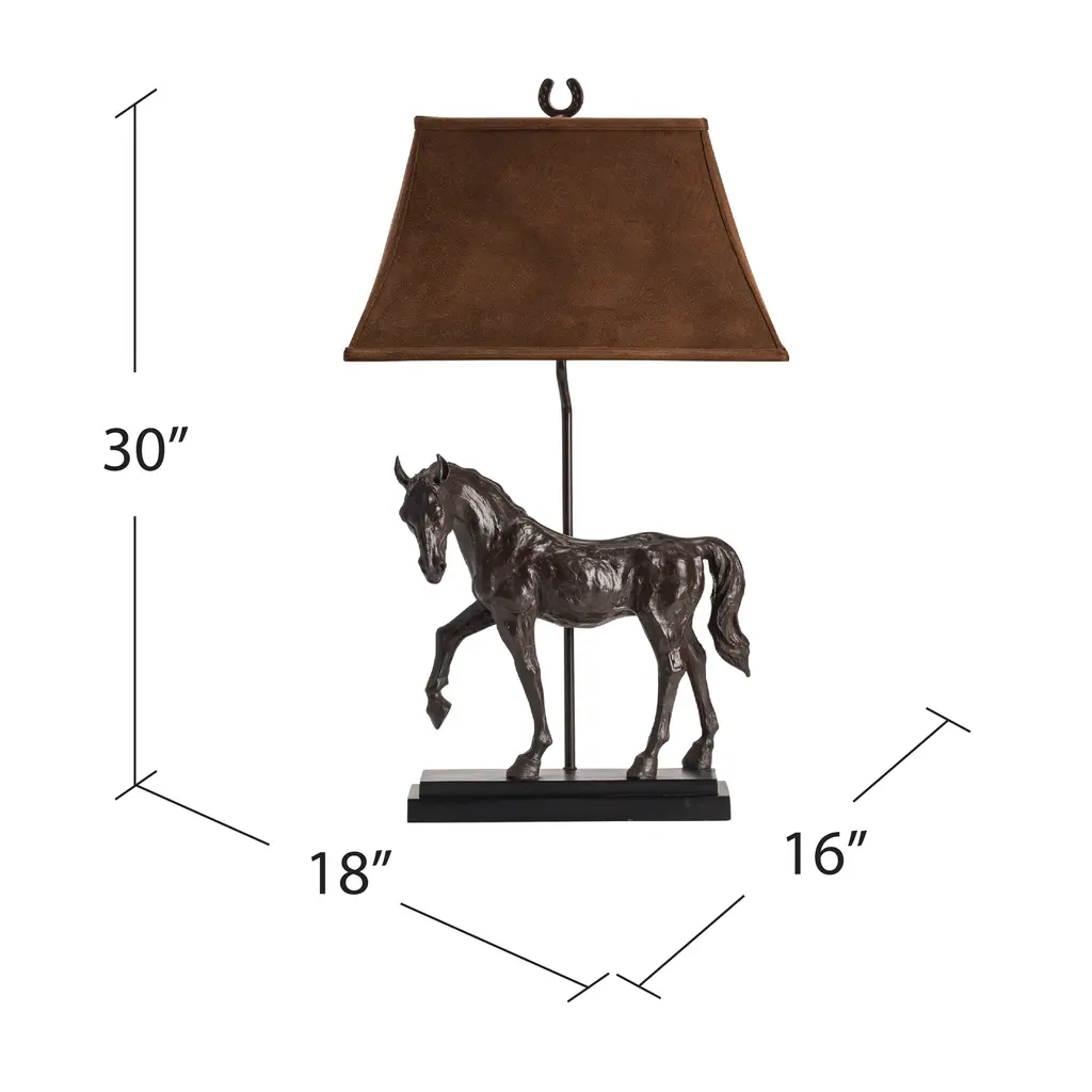 The Bronze Horse Table Lamp features a horse made from poly-resin material at the base. The lamp has a bronze finish that reminds you of the country. Display your love of nature and add to the western decor of your home or farmhouse by placing this lamp on any table. The woven fabric shade is sand-colored faux suede with horseshoe finial that completes the classic western style. Uses one maximum 100 watt standard-medium base Type-A 3-way bulb (not included). 3-way socket switch. Faux suede tapered shade is 11" wide and 8" deep at the top x 18" wide and 16" deep at the bottom x 11" high.6 ft black cord.
