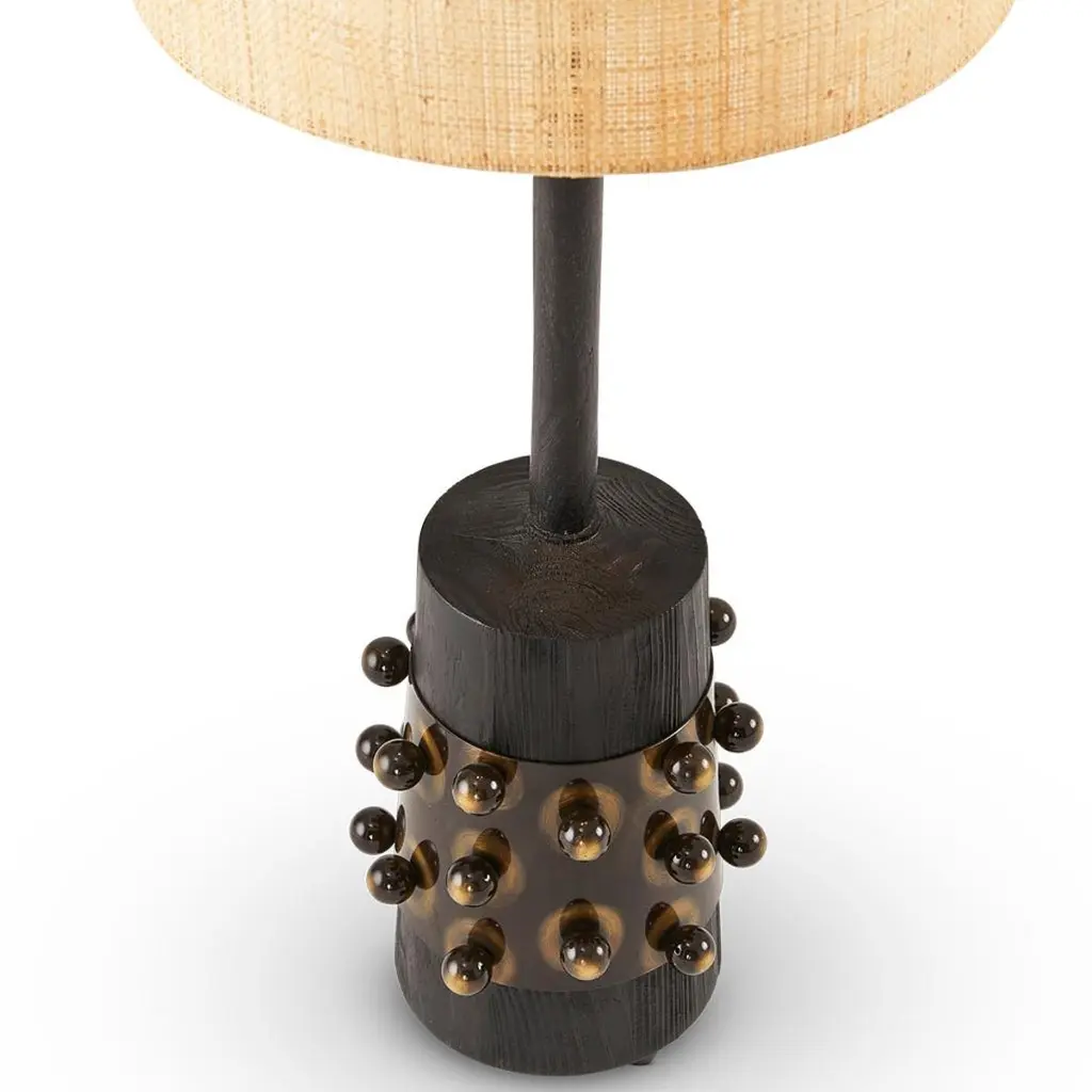 The Silhouette lamp collection is inspired by Brutalist forms. The dark Ebonized Oak is combined with bronzed steel components and finished with a raffia shade.The Silhouette lamps are tall at 107CM which give them a strong sculptural presence in a room especially when displayed as a pair.The beauty of this lamp is that it complements most styles, it can live equally well in a natural, minimal, mid century modern or African inspired interior. There are options on the lampshade, the raffia can be replaced with other textiles.