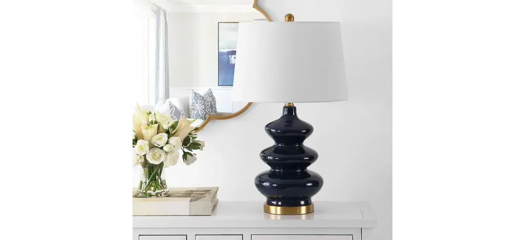 Ideal for heightening the decorative drama in clean-lined rooms, this Brooks Table Lamp undulates with a sense of depth and motion. Brooks's sculpted navy blue ceramic and triple gourd silhouette offer a sophisticated feel while its gold base and finial are a glamorous finishing touch.