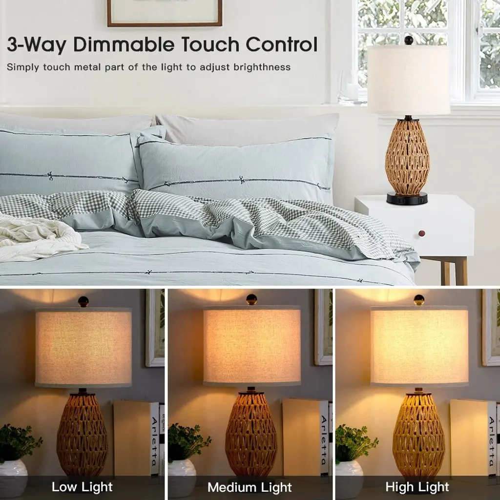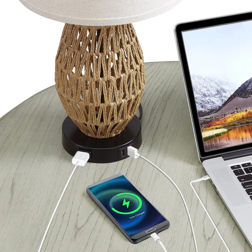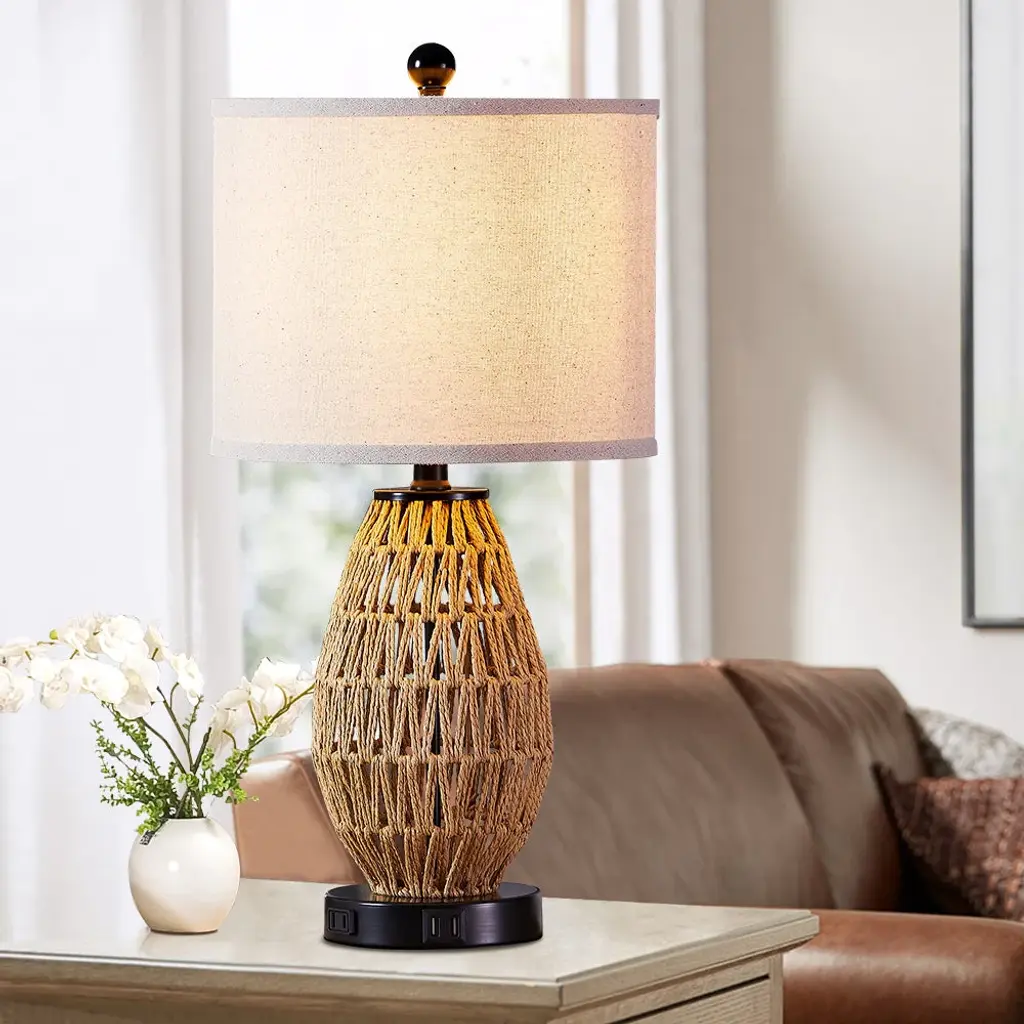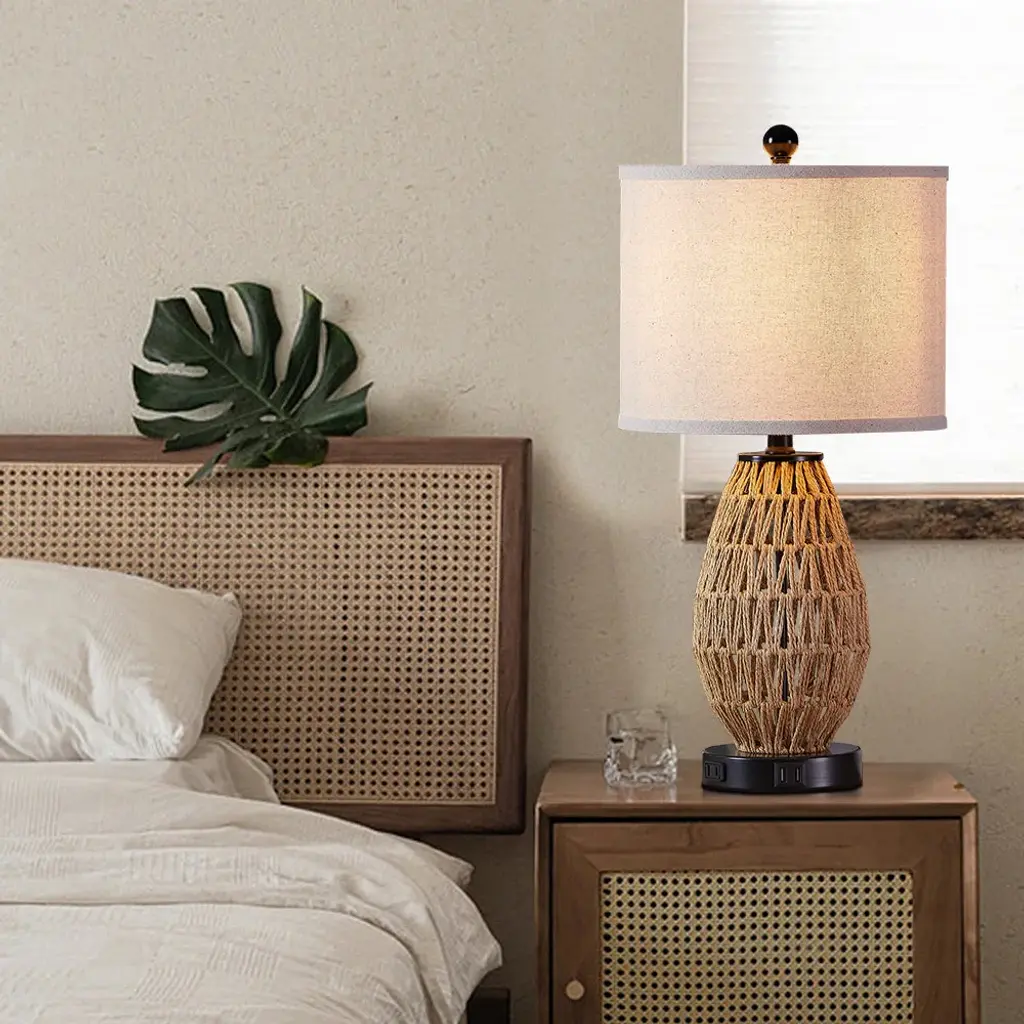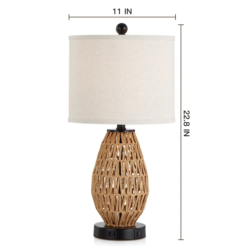 The table lamp pairs with a white drum style shade. That's better to elevate the ambiance of your space. It takes into account different usage scenarios. Effortlessly adjust the brightness to suit any occasion, from cozy movie nights to focused reading sessions. With just a gentle touch, you can transform your environment with the ideal lighting intensity. To cater to your modern lifestyle, the table lamp is equipped with dual built-in USB charging ports and an AC outlet. Charge your devices conveniently while enjoying the gentle glow of the lamp, making it a better addition to your home office setup. The base is meticulously crafted from a combination of mixed rattan and metal, creating a unique and eye-catching aesthetic that effortlessly complements various interior design themes. The juxtaposition of natural elements and contemporary design makes the lamp an artful addition to your decor.Overview of features: