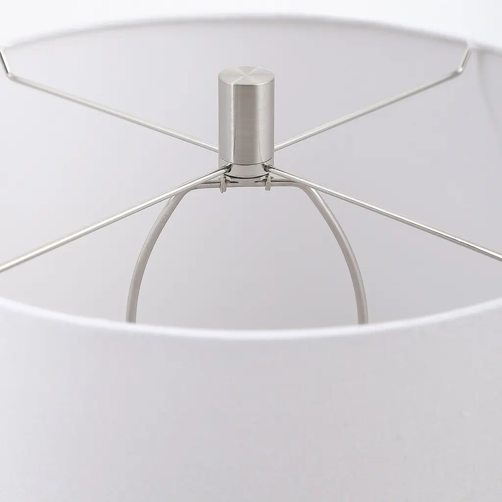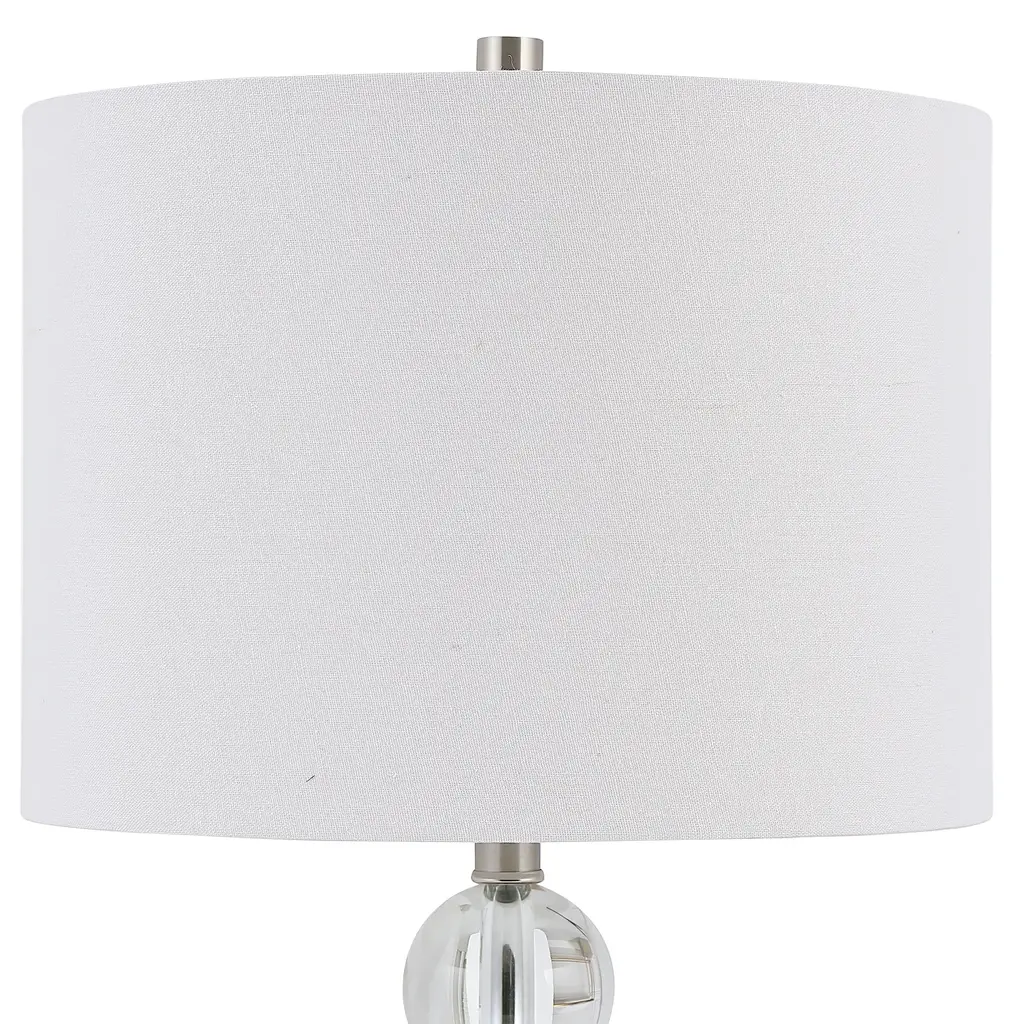 This simple but elegant table lamp is finished in brushed nickel with crystal accents. The round hardback shade is a white linen fabric with light slubbing. Features: Set includes: One (1) table lamp Materials: Metal, crystal Finish: Brushed nickel, crystal Shade color: White Voltage: 110V Wattage: 150W Bulb quantity: 1 Number of light: 1 Shade description: Round hardback Dimensions: Table lamp: 29.5 inches high x 14 inches wide x 14 inches deep Shade: (14x14) inches top x (14x14) inches bottom x 10 inches high This product will ship to you in one (1) box. Accessories pictured are NOT included. WARNING: WARNING: This product can expose you to chemicals including nickel which is known to the State of California to cause cancer. For more information, go to www.P65Warnings.ca.gov/furniture.