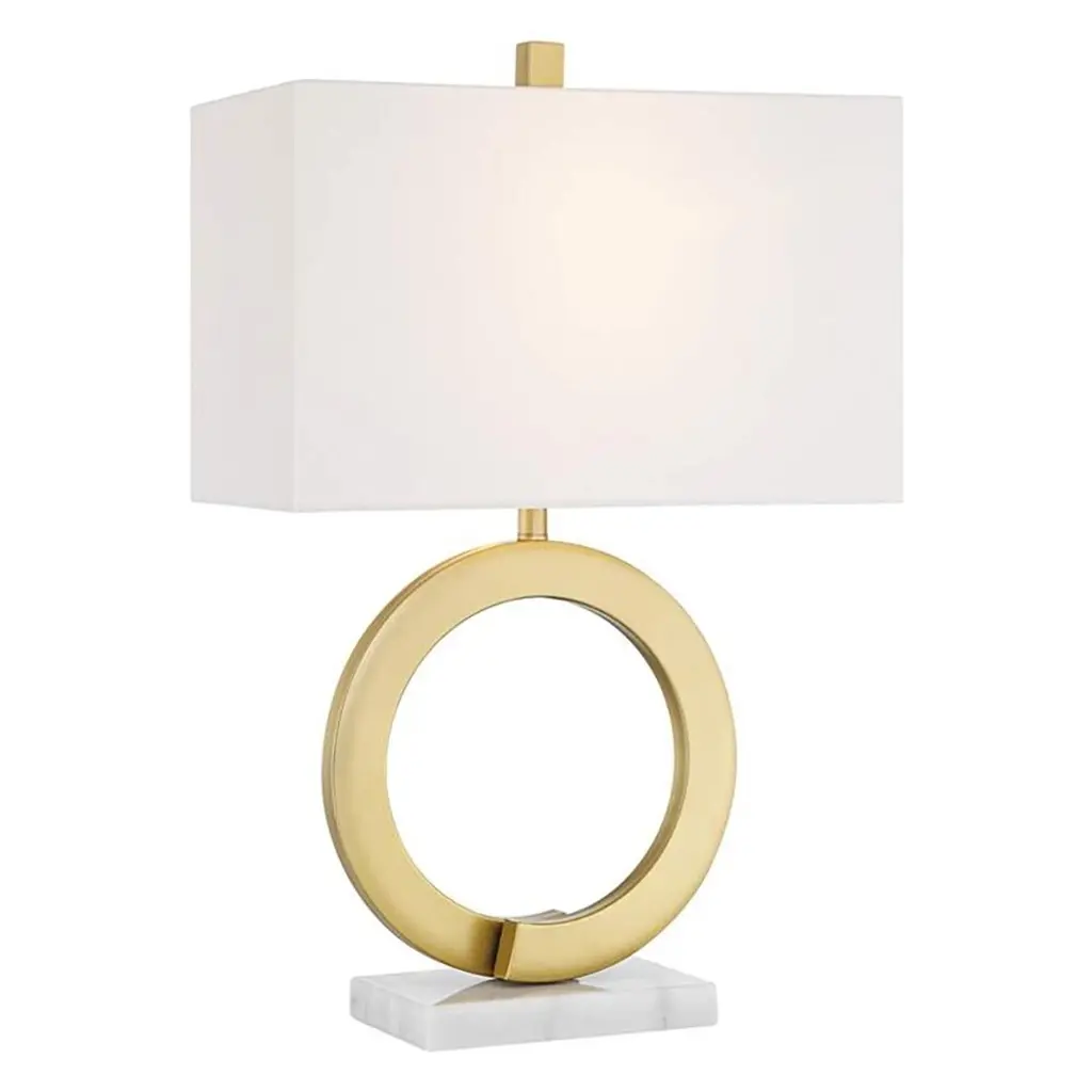 4 3/4" high overall. Base is 8" wide x 5 1/4" deep. Rectangular shade is 16" across the top and bottom x 9" deep x 10" high. Weighs 8.25 lbs. Uses one maximum 100 watt standard-medium base 3-way light bulb (not included). 3-way socket switch for easy lighting control. Bryce modern ring table lamp Open ring base in a gold finish. White marble at the very bottom. Metal and marble construction. Rectangular lamp shade in a white fabric. 8-foot long cord. The metal circle has an open ring profile that's light and airy. The ring ends overlap for additional visual interest. At the very bottom of the lamp is a real marble rectangular base. Up top is a white fabric rectangular lamp shade.