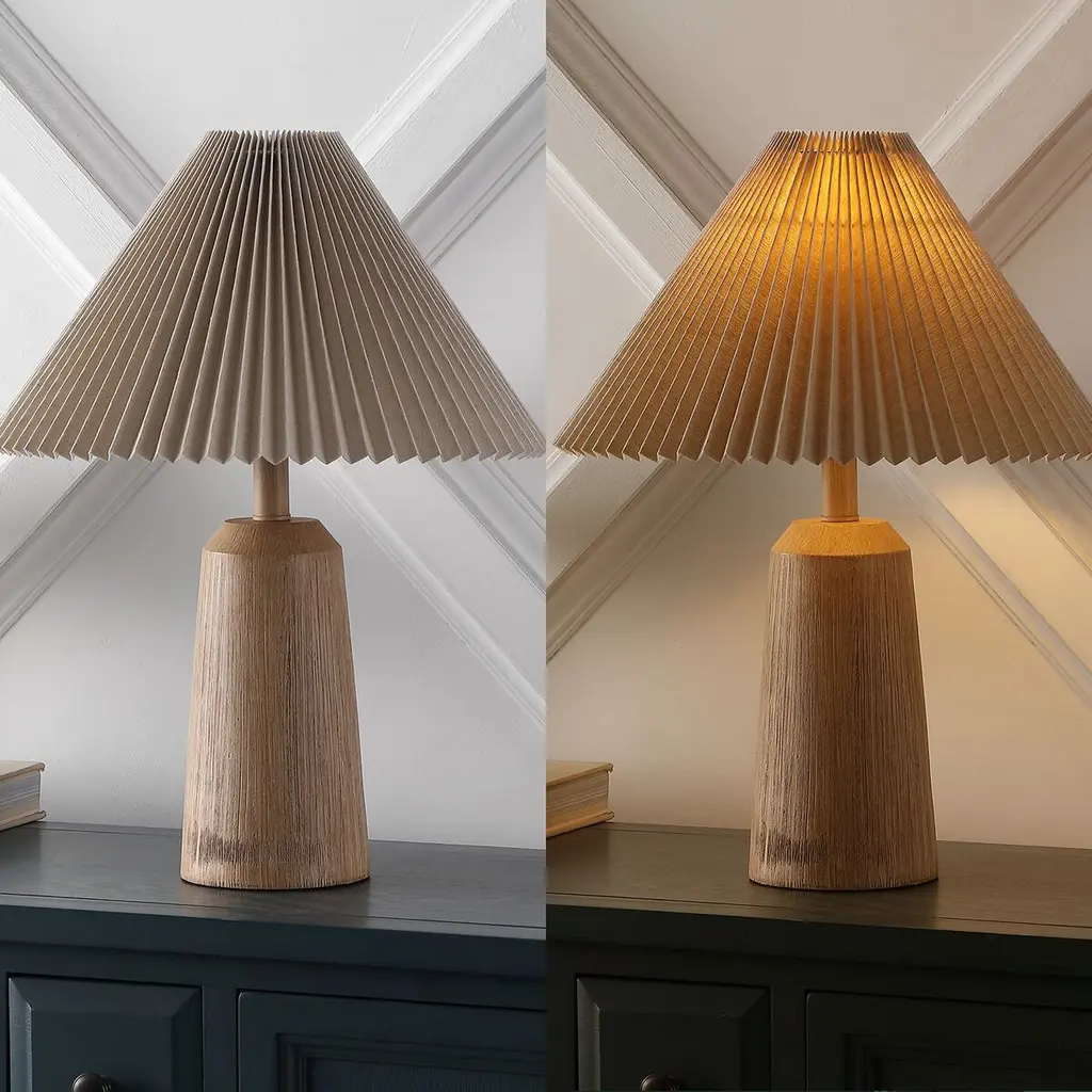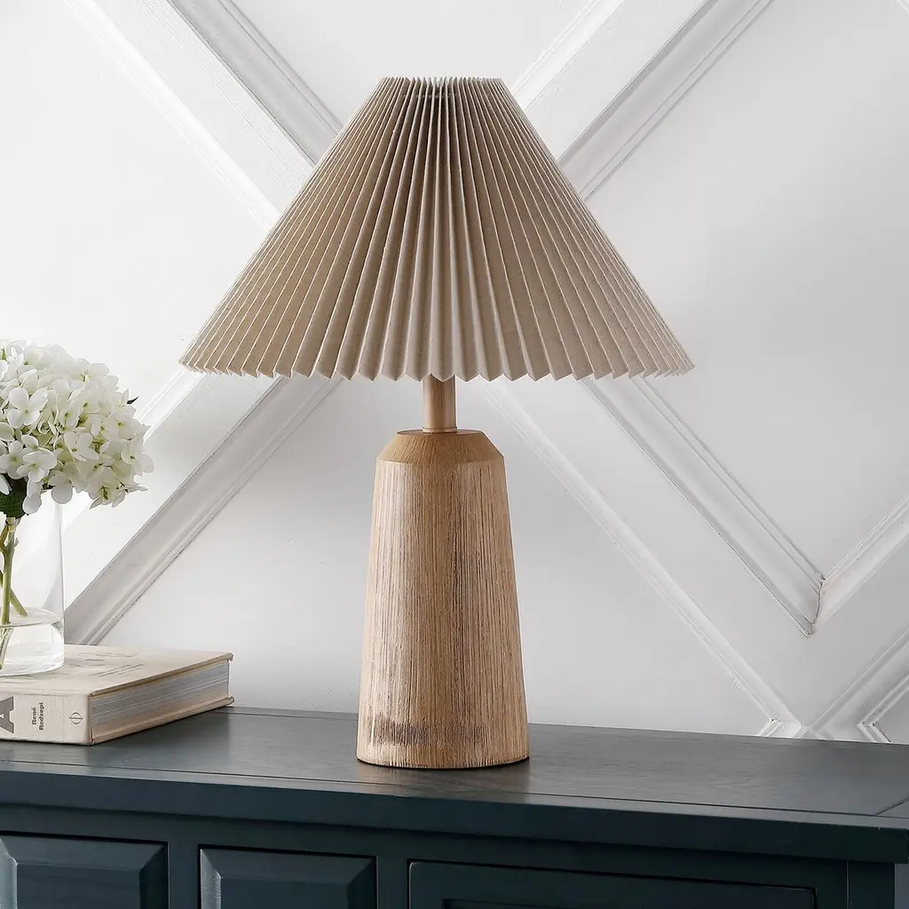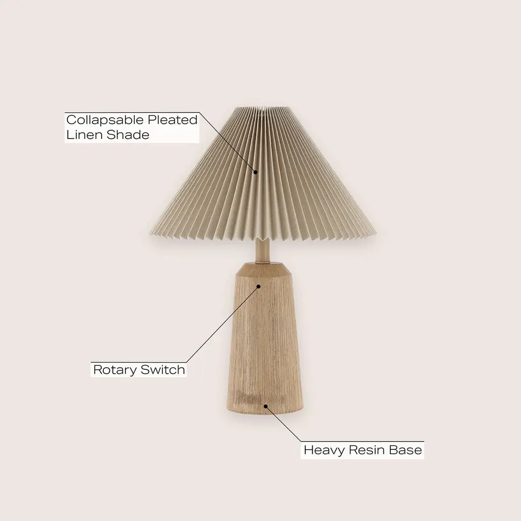 Inspired by mid-century modern Danish pottery lamps, this cool vintage style lamp features a heavy resin base and pleated, linen shade. Our minimalist lamp is perfect for a modern bedroom, living room, or entry. Includes an LED bulb for warm, bright light.