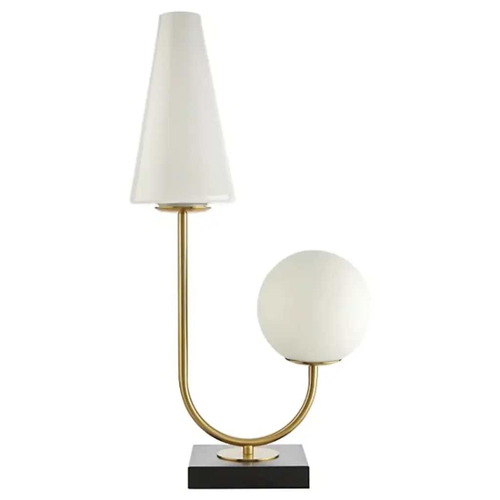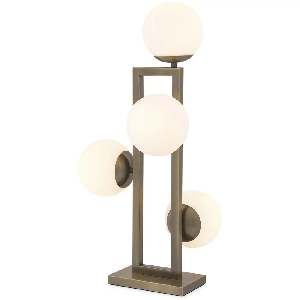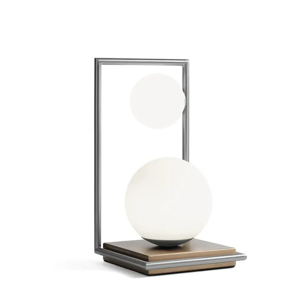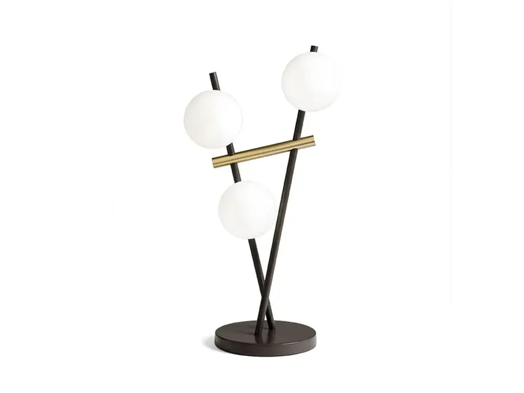 Table lamp from the BUBLE collection in steel (steel or brushed gold finish and bronze detail) with 2 opaline blown glass spheres. Lamp equipped with Dimmer.Light source: G9, Power: 2x10W LED - DIMMA frame with a view onto our dynamic lifestyles. Toughness and liveliness coexist, with the stiff and squared frame containing and supporting BUBLE, a series of opal glass bubbles, in multiple sizes and positions. The asymmetric lights articulate the space, with their proportions giving it balance, and the assembly making BUBLE fascinating and timeless.