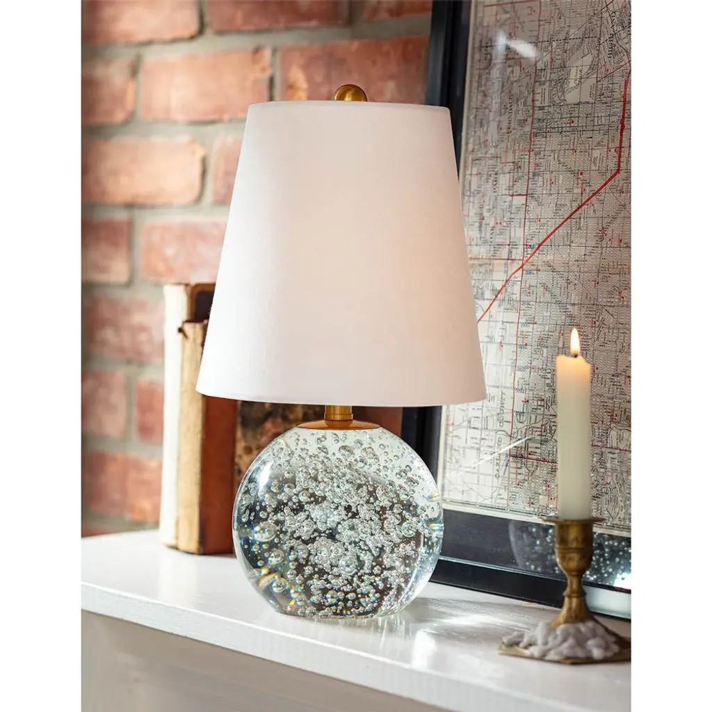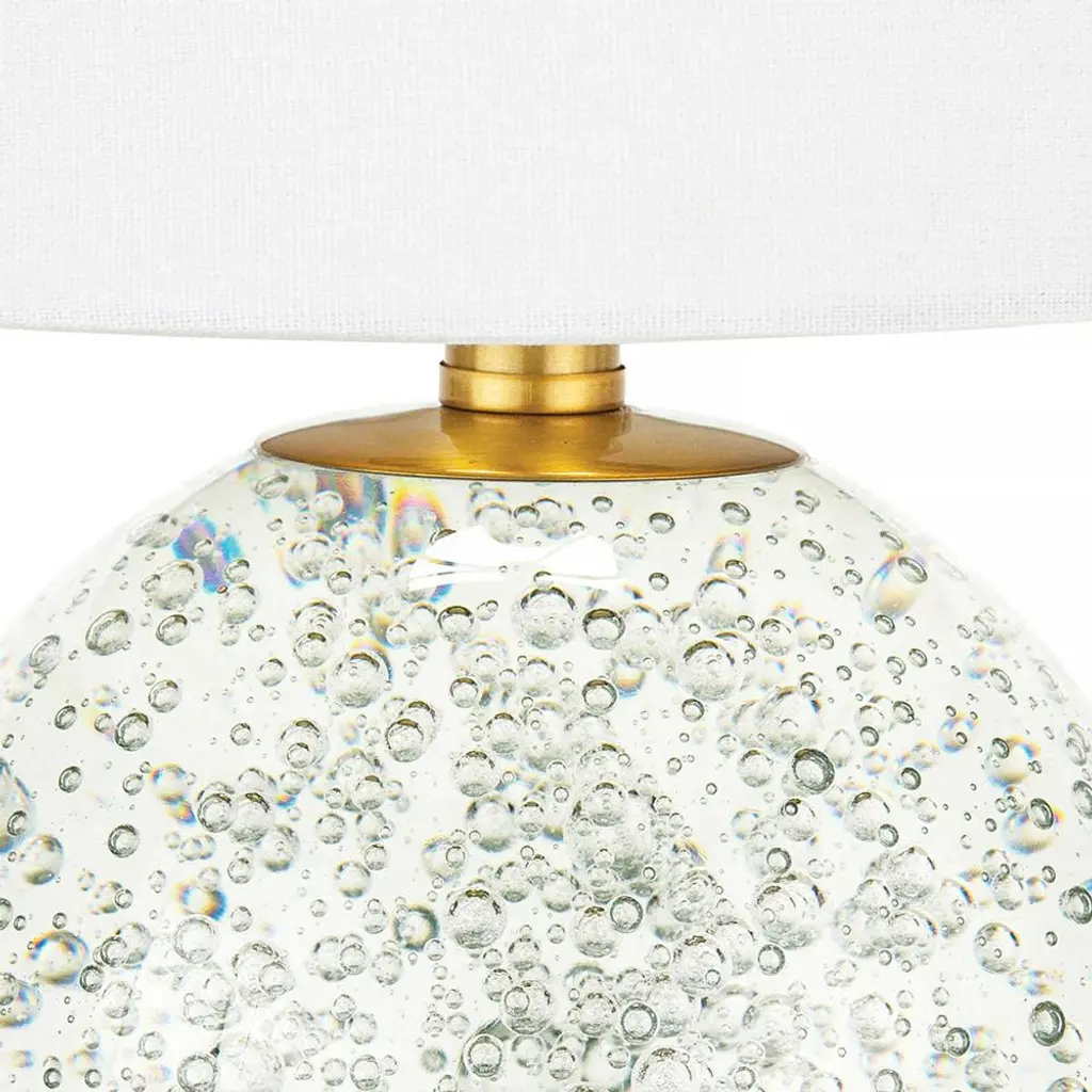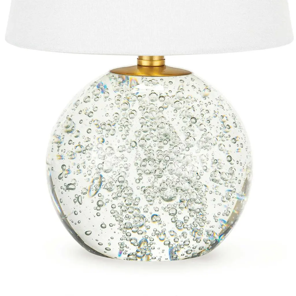 Illuminate your home in style with our Bulle Hollywood Regency Clear Crystal Base Mini Lamp. Designed with a classic spherical silhouette and crystal body, this designer table lamp features organic bubbles within the clear crystal body, and also has a brass neck and a ball finial.