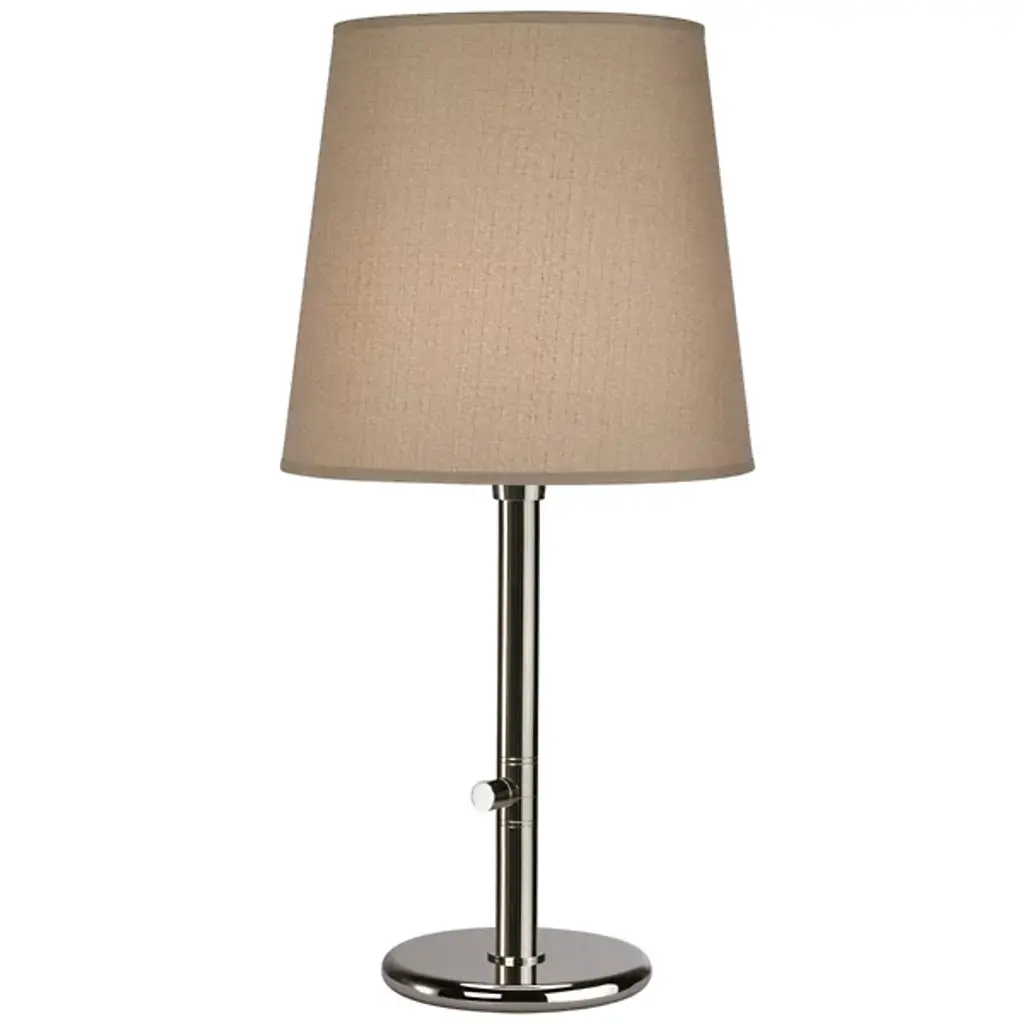 The Robert Abbey Buster Chica Table Lamp offers a straightforward design with a classic drum shade and polished metal stand. Full range dimming capabilities may be manipulated with the turn knob on the stem.