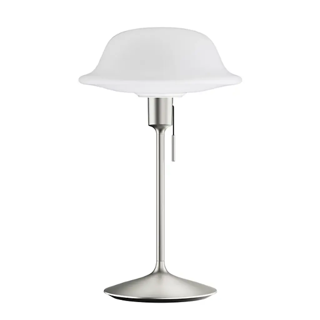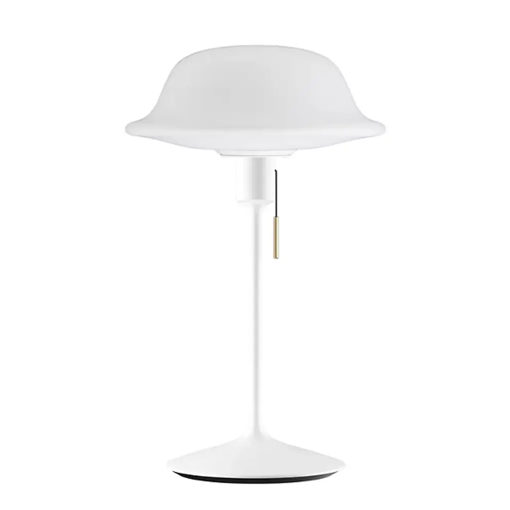 With the glass shade made using mouth-blown opal glass on prominent display, the Butler Table Lamp by UMAGE enchants on first look, drawing inspiration from the beloved French novel Le Petit Prince and featuring a versatile shape that invites artistic interpretations. Designed by Luigi Vittorio Cittadini, its milky hue and curving form create a gentle yet enduring ambiance in any room. Inspired by the delicate stem of a champagne flute, the lamp's sleek table stand offers a sophisticated touch to desks, console tables, or bedside tables, with a discreet built-in USB port for convenient device charging. Its curved silhouette casts a warm glow enhanced by shadowy elements, combining contemporary simplicity with a hint of retro allure. It becomes a captivating addition to side tables, workspaces, and reading nooks alike.