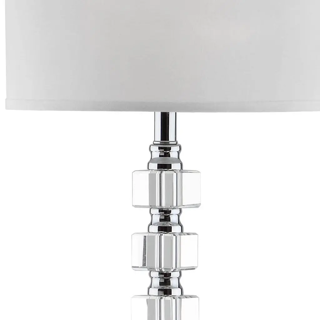The Dainolite C182T Table Lamp will make your household shimmer and sparkle with crystal clear radiance. This brilliant table lamp features optical crystal orbs fashioned in a linear style from top to bottom of its design. Its stands firmly in solid metal construction in bright polished chrome. Both finishes beautifully complement its clean white shade for a classic meets contemporary elegance. Touches of opulence bring a glamorous and rich feel to this high-quality table lamp.Canopy/Back Plate Height: 2" Canopy/Back Plate Diameter: 6.25" Shade Height: 10" Shade Top Diameter: 12" Shade Bottom Diameter: 14"