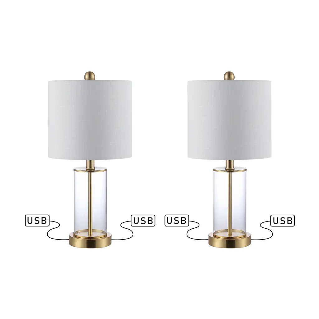 Sleek and sophisticated, this table lamp pairs a clear glass with metal finish accents, it has two handy USB charging port too. The charging feature is ideal for vacation homes and hospitality projects. With its totally translucent base, this piece is a clear winner. Features:Dimensions:About us:You see a lamp.We see a decorative work of art.A perfectly curved shade casts a dramatic shadow on a floor. Compatible with LED lightbulbs: as easy on the environment as they are on the eyes. The JONATHAN Y Lighting collection considers every detail from impeccably sourced materials to designer styling. And our prices are so attractive, we've transformed a functional necessity into a fashion accessory.JONATHAN Y Lighting - a fashion revolution in home decor.