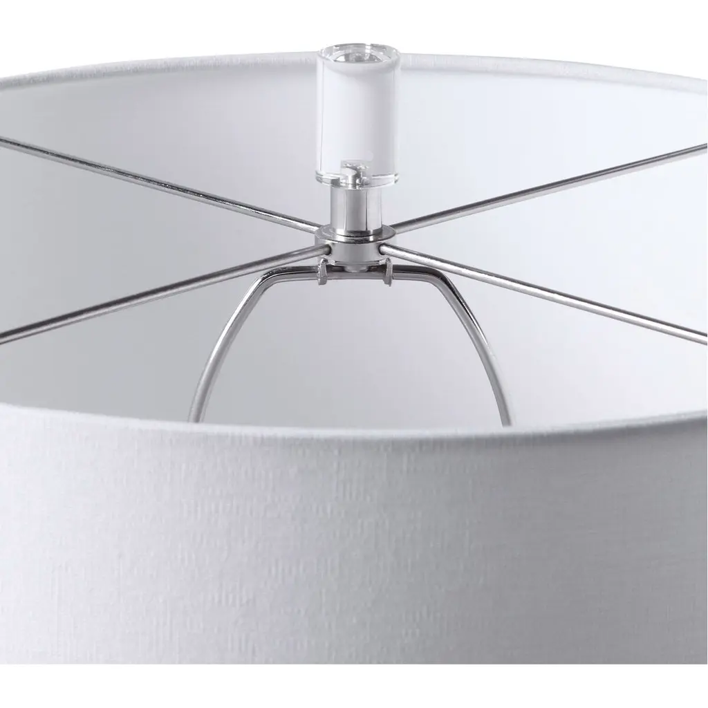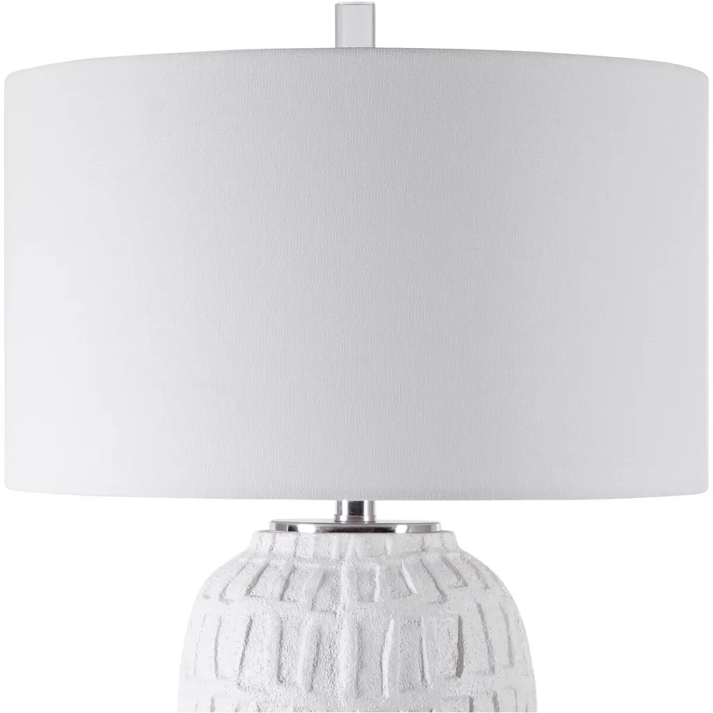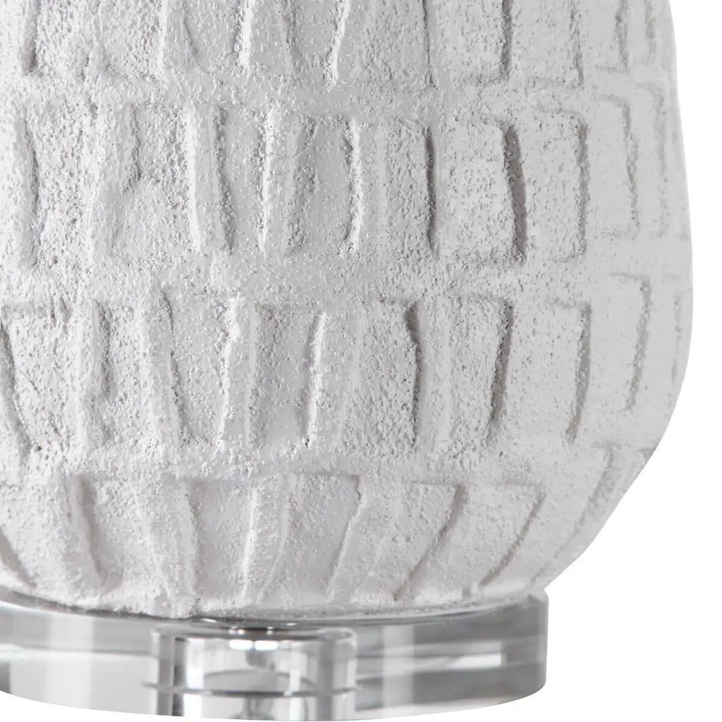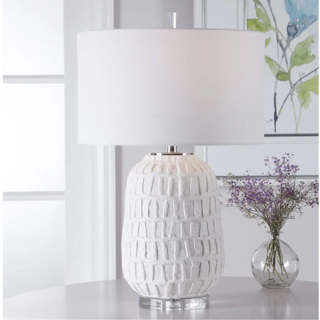 A Modern Take On Old World Style, This Table Lamp Features A Textured, Matte White Ceramic Base With An Organic Grid Design Displayed On A Thick Crystal Foot With Polished Nickel Accents. The Lamp Is Paired With A White Linen Drum Shade.
