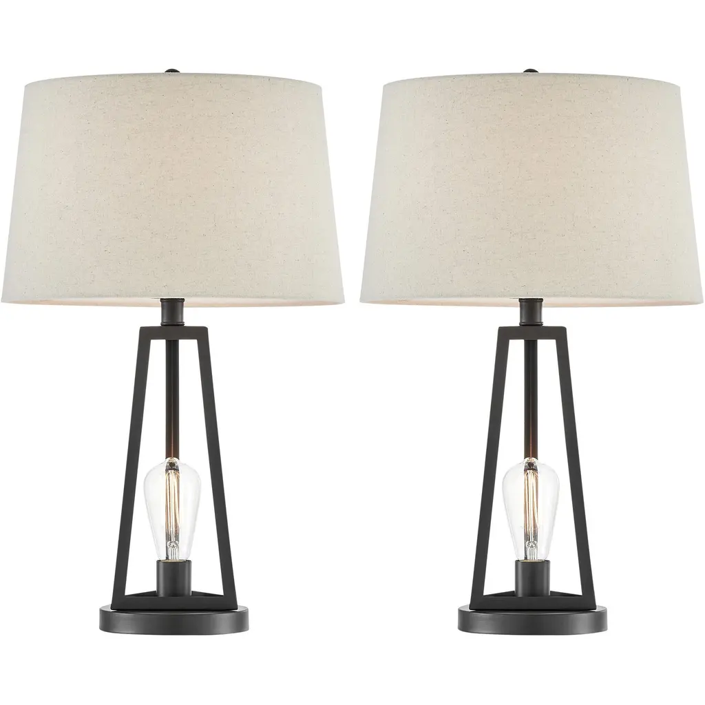 A graceful interplay of sculptural design and calming visual contrast gives the Cahalan Court table lamp a look that is both effortlessly modern and timelessly elegant. Each lamp features an open oval body finished in rich black, creating an airy yet grounded silhouette. The crisp white drum shades offer a harmonious balance and softly diffuses light for a warm and inviting glow. A squared base adds structure and stability, completing the look with a confident touch.