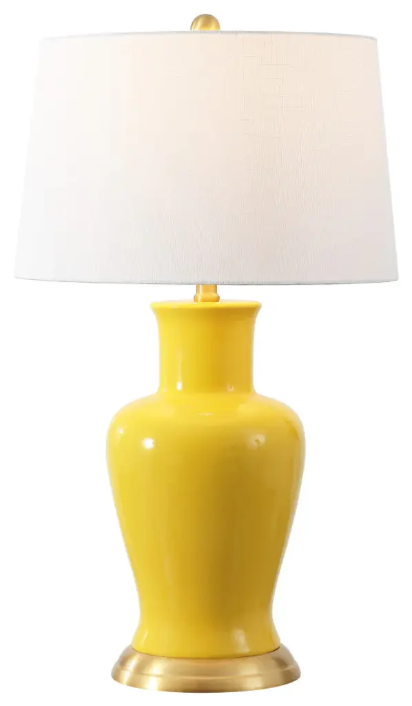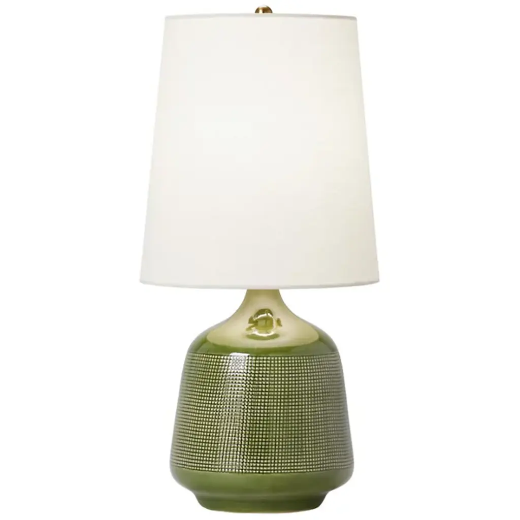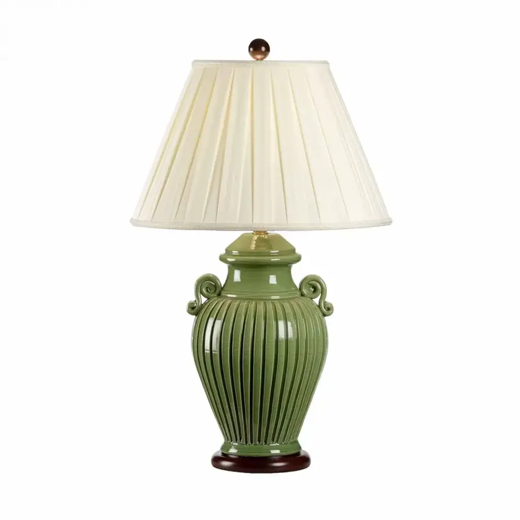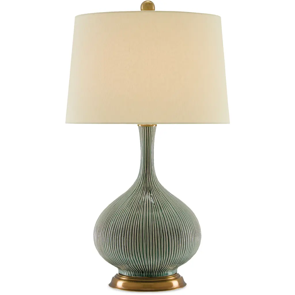 The striations of the ceramic emphasize this table lamp's fluid curves. The antiqued brass finish of the base and the linen shade set off the luminous green of the body to perfection.