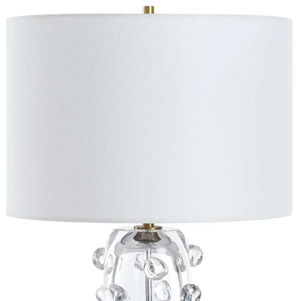 The Caius Table Lamp is a stunning blend of elegance and modern design. Its clear glass base, adorned with organic glass spheres, exudes a sense of refined sophistication. This exquisite base is complemented by a plated brushed brass foot, adding a touch of luxury to any space. Topping off this beautiful piece is a round drum hardback shade crafted from crisp white linen fabric, which provides a soft, inviting glow. The Caius Table Lamp is a perfect addition to elevate the ambiance of any room.