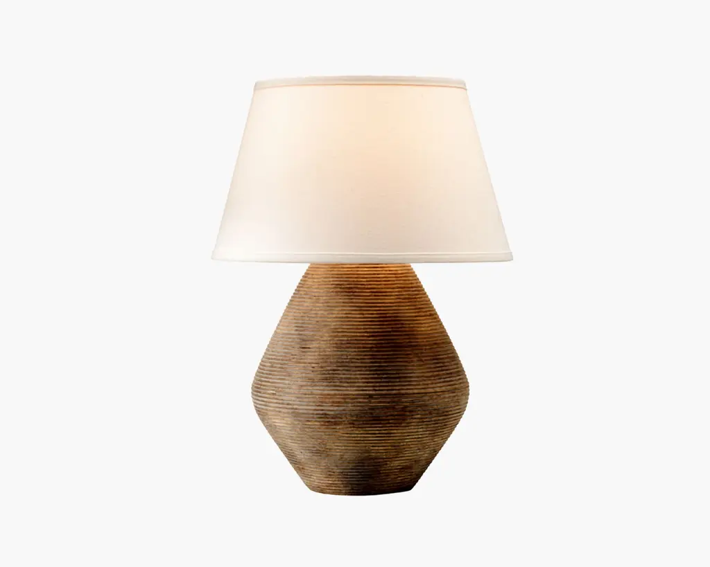 Inspired by the sun-soaked beaches of southern Italy, the Calabria family of table lamps features earthy, textural finishes and curvy silhouettes. The large conical linen shades complement the rustic appearance of these treasures. Layered together, they bring an organic beauty into any space.