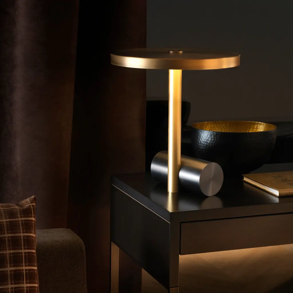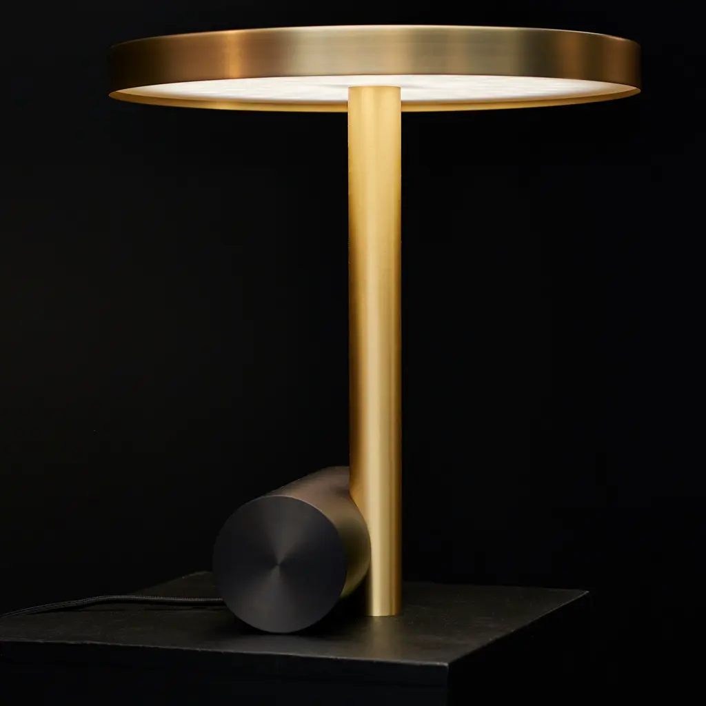 Extra Large, the grand table lamp from the Calé(e) collection, continues the range’s visually compelling motif of contrasting metal shapes. Parisian designers Léa Padovani and Sébastien Kieffer, known as studio Pool, fashion the lamp’s elements from solid brass, available in 4 different finishes. The flat shade with an integrated LED light source and a polycarbonate diffuser provides an expansive spread of even bright light suited to a desk or for general room illumination.