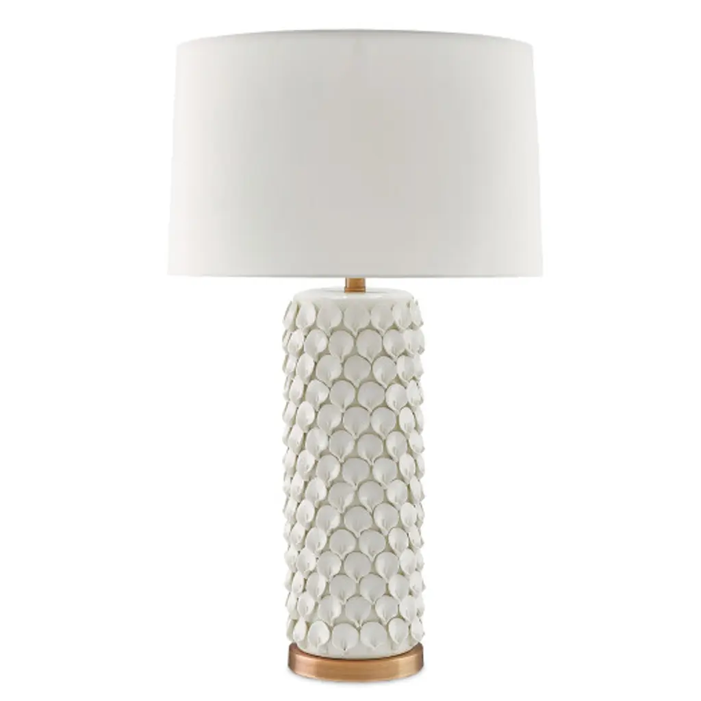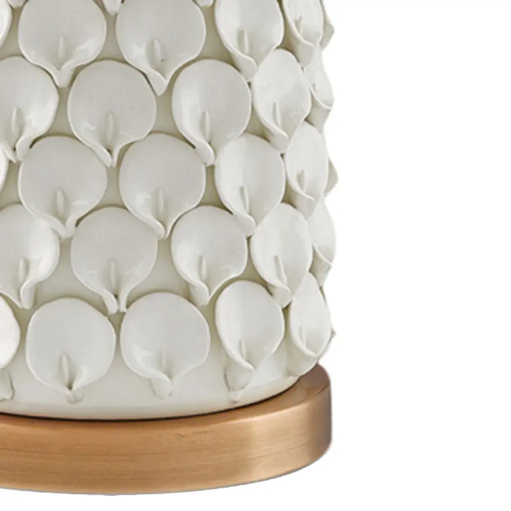 Intricate hand-formed ceramic flower petals cover the surface of the table lamp. The textural interest of the petal-covered column is heightened by the antique brushed-brass accents. The lamp is topped with an eggshell shantung shade that completes this pretty composition.