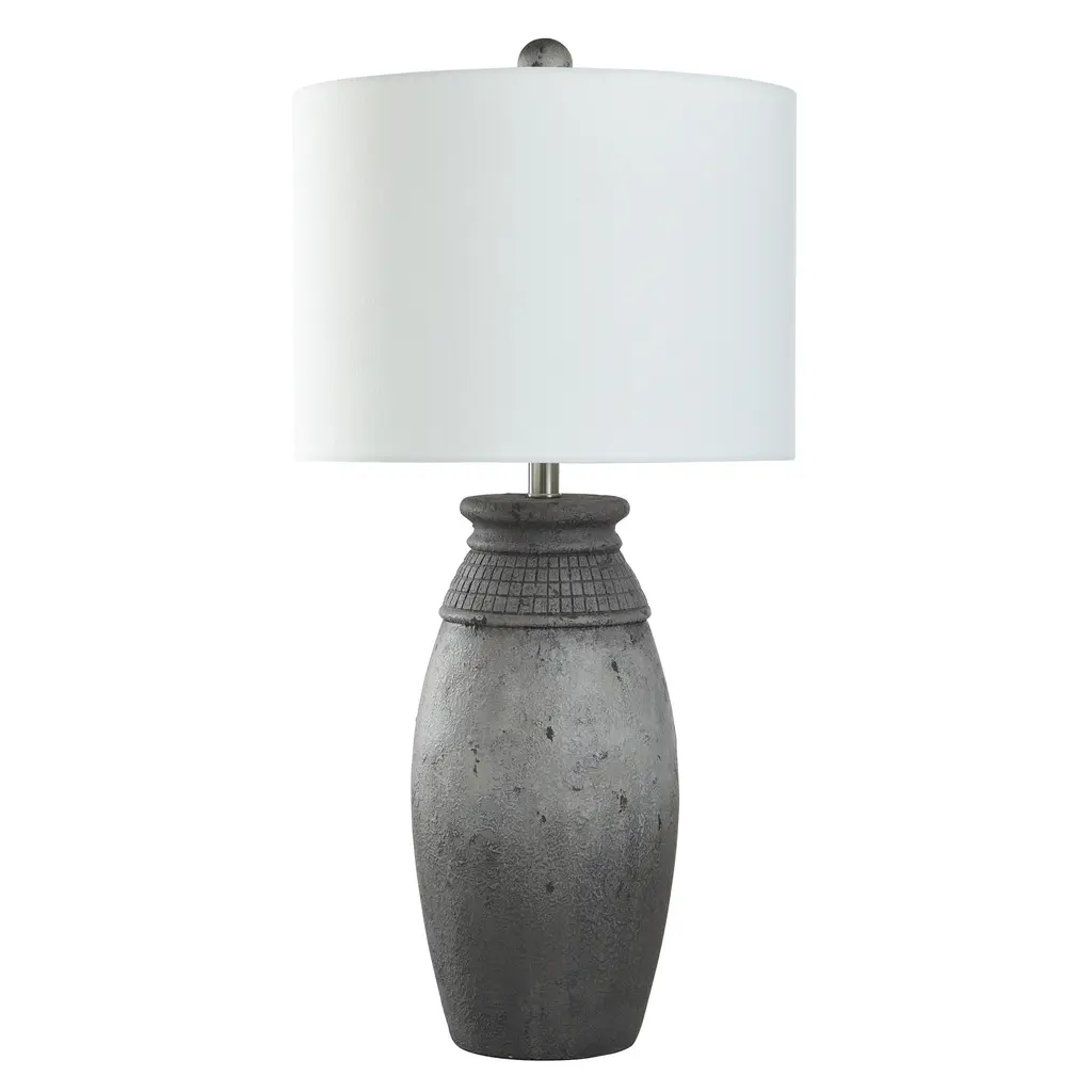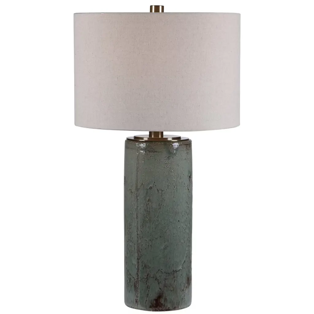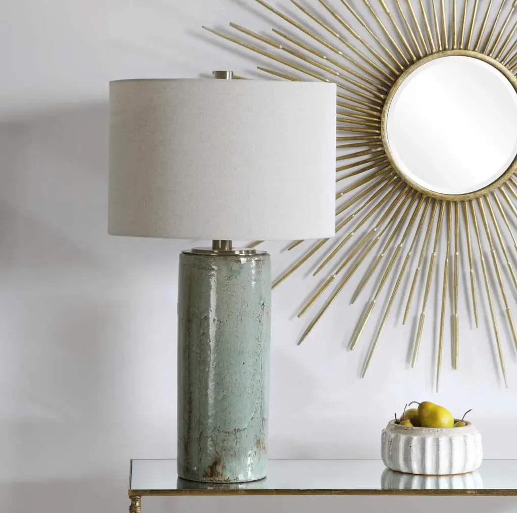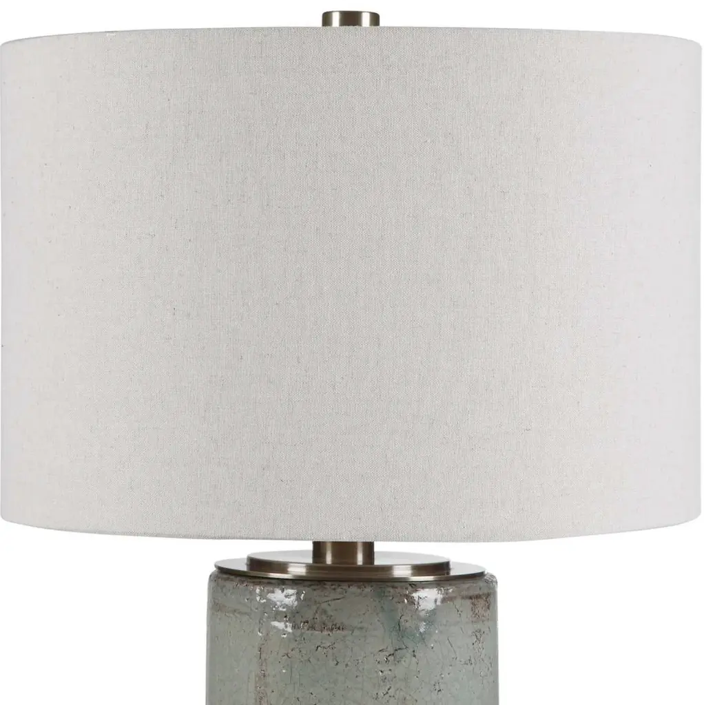 The Callais ceramic table lamp has a crackled aqua blue glaze finish with dark rustic bronze distressing, accented with light antique brushed brass details and a hardback light beige linen shade.