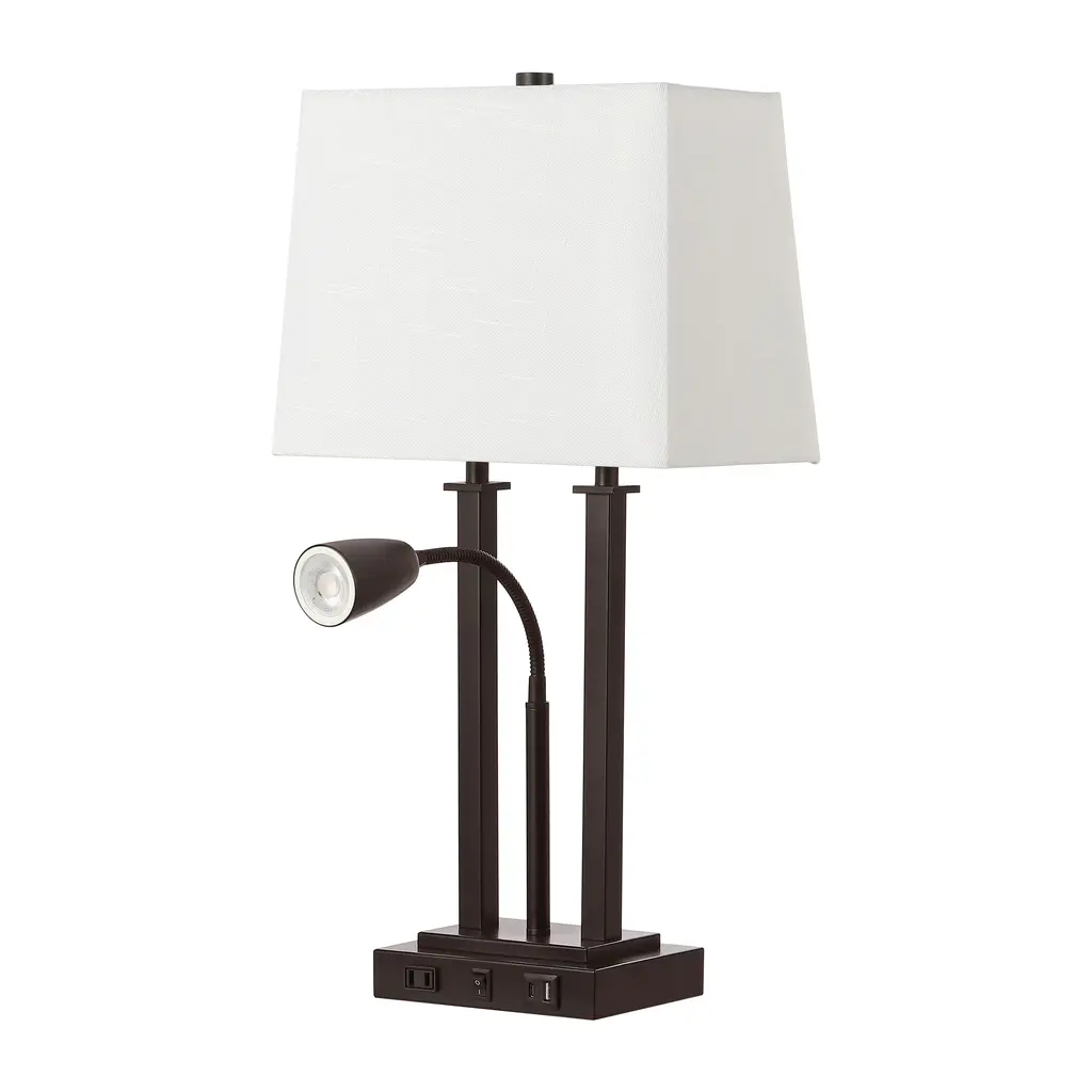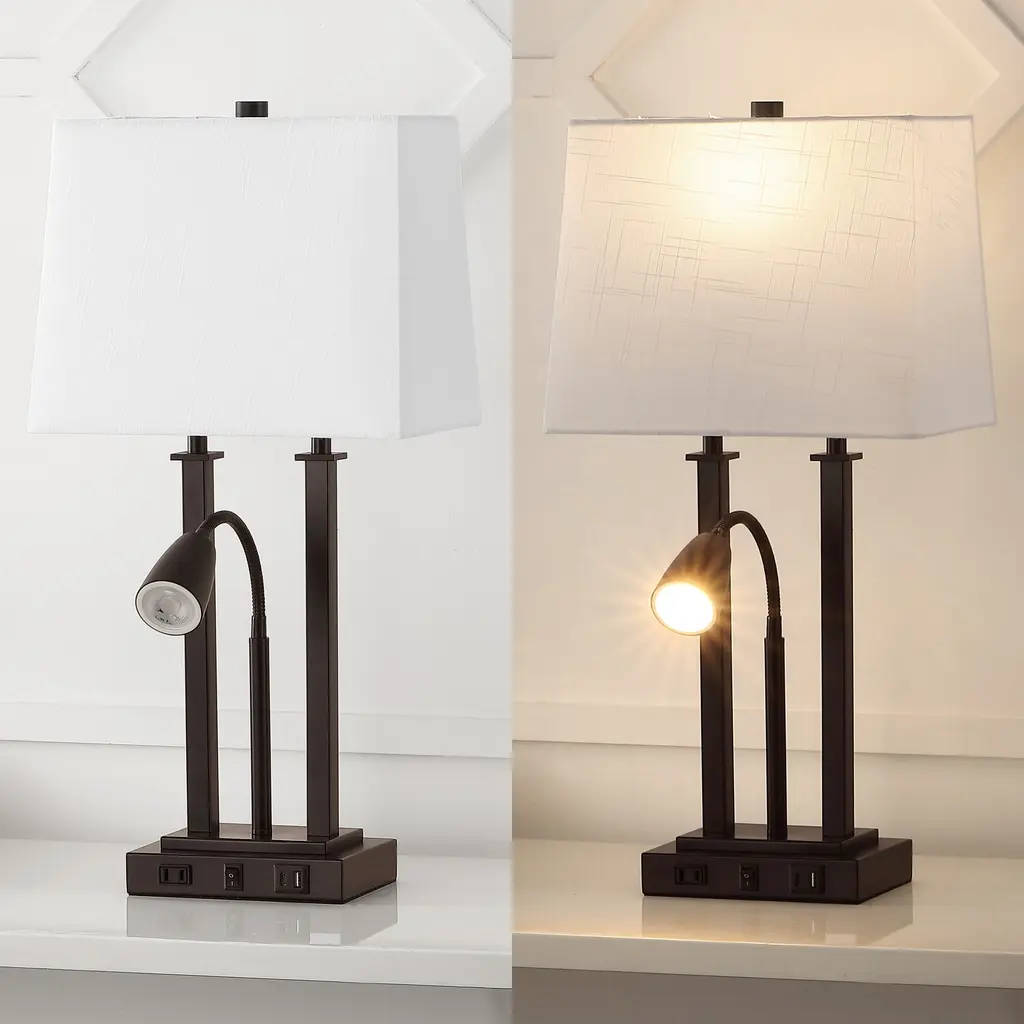 The two-column design of our modern reading lamp adds classic style to the bedroom or living room. In addition to a traditional lampshade, they have an adjustable reading light for focused work. Energy-saving LED bulbs and charging outlets in the base make these lamps ideal for your vacation rental.Features:Dimensions:About us:You see a lamp.We see a decorative work of art.A perfectly curved shade casts a dramatic shadow on a floor. A silk cord you never want to hide. Compatible with LED lightbulbs: as easy on the environment as they are on the eyes. The JONATHAN Y Lighting collection considers every detail from impeccably sourced materials to designer styling. And our prices are so attractive, we've transformed a functional necessity into a fashion accessory.JONATHAN Y Lighting - a fashion revolution in home decor.