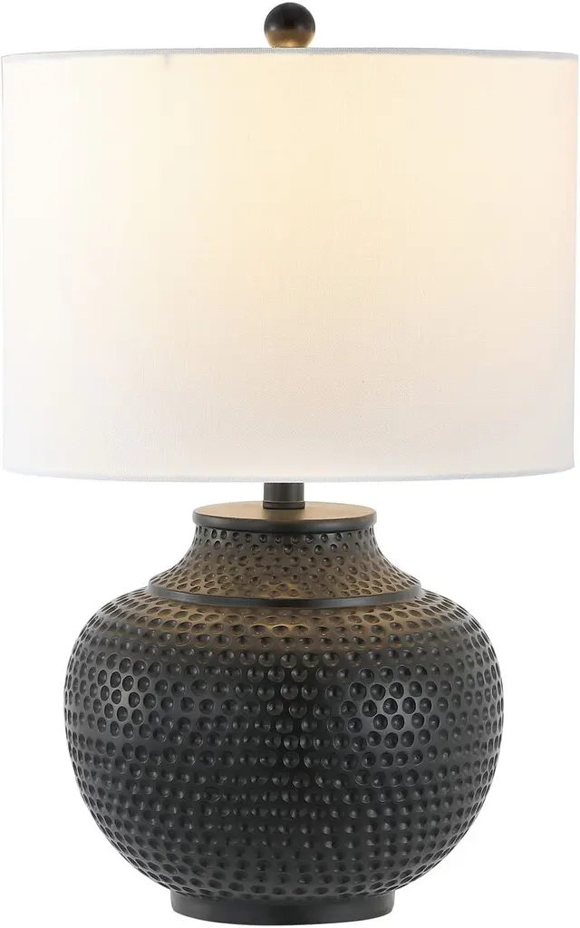 Rows of recessed dots accentuate this table lamp's curvaceous shape, which was inspired by ancient oil lamps. The crisp white cotton shade contrasts the black matte finish of the lamp's body perfectly.