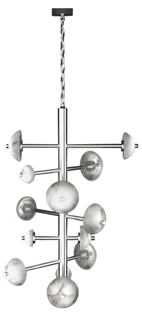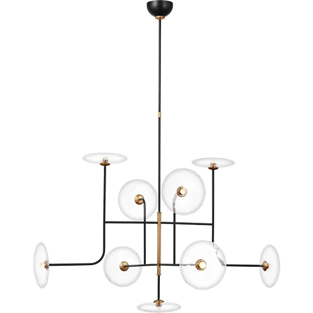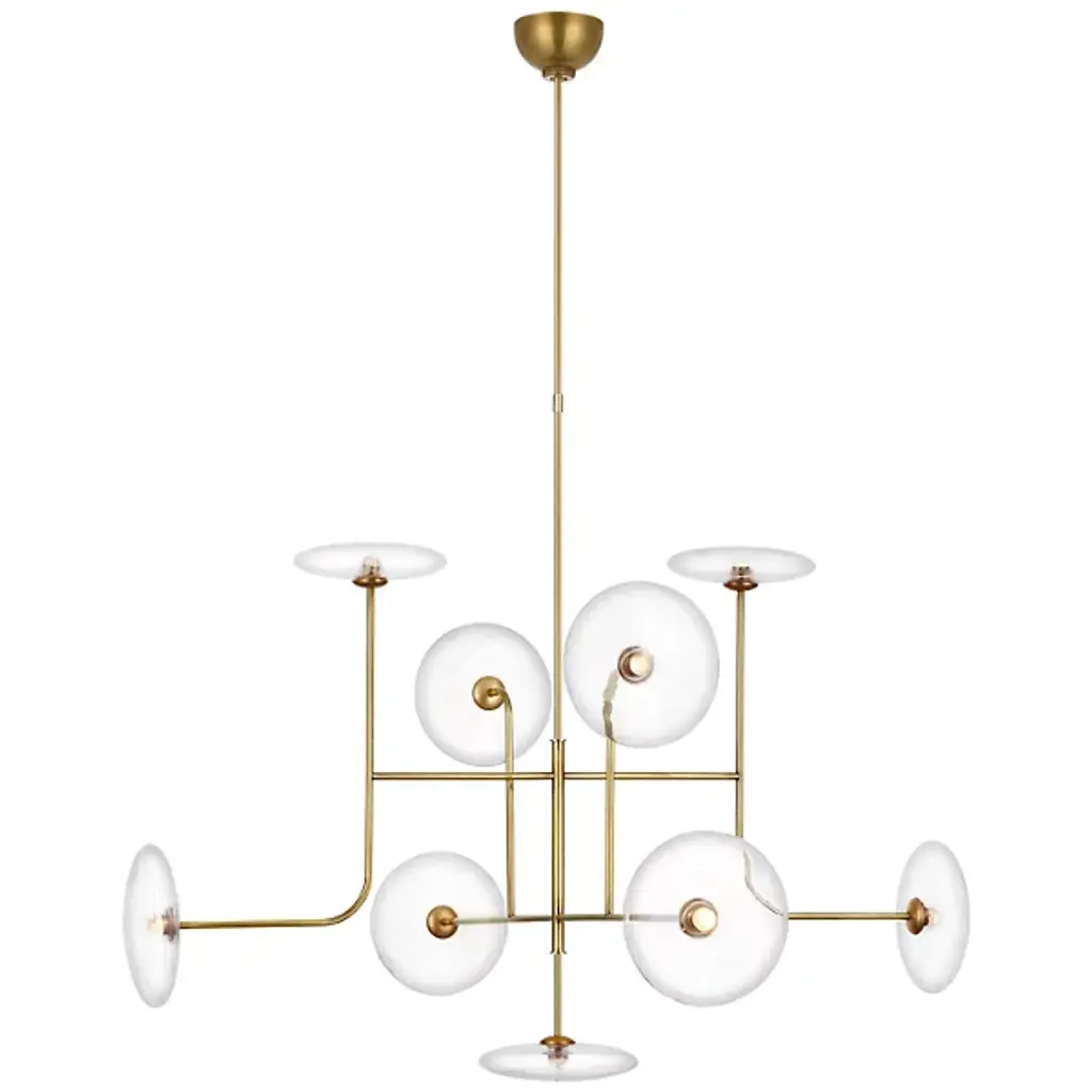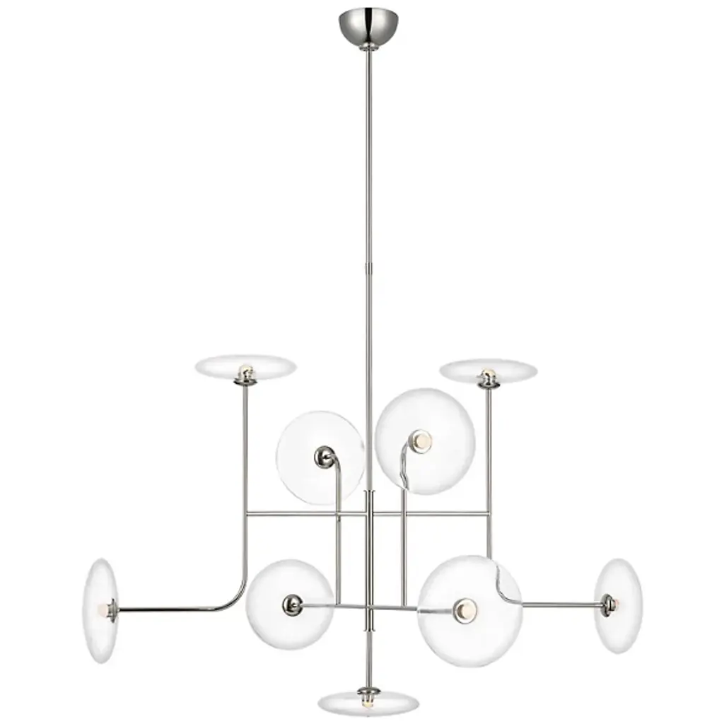 A wide-reaching open design with a stylish sculptural spirit. The Calvino LED Arched Chandelier from Visual Comfort Signature, formerly known as Visual Comfort, offers a slender, appealing addition to large, high-ceilinged spaces. A dome-shaped ceiling mount retains the fixture from above, sending down a matte-textured slim central stem to a cylindrical sleeve that extends a set of slender, horizontal bracings. These small arms then support a series of slim, curving arms headed out in all cardinal directions. Each arm terminates in a small, damp-rated lamp at the center of a shallow, clear glass dish shade that moderates glare from the sides while focusing out a wide wash of direct light in all directions.